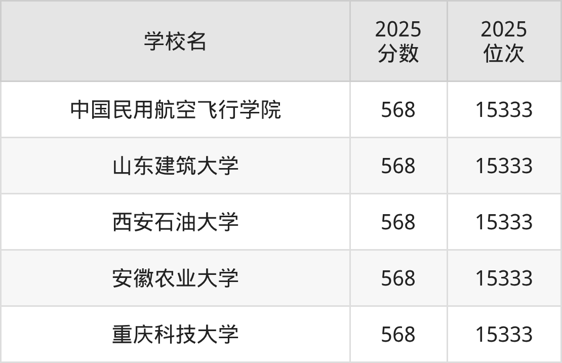 包含:中国民用航空飞行学院、山东建筑大学、西安石油大学、安徽农业大学、重庆科技大学。