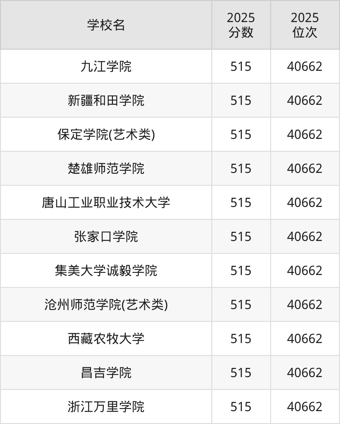 包含:九江学院、新疆和田学院、保定学院(艺术类)、楚雄师范学院、唐山工业职业技术大学、张家口学院、集美大学诚毅学院、沧州师范学院(艺术类)、西藏农牧大学、昌吉学院。