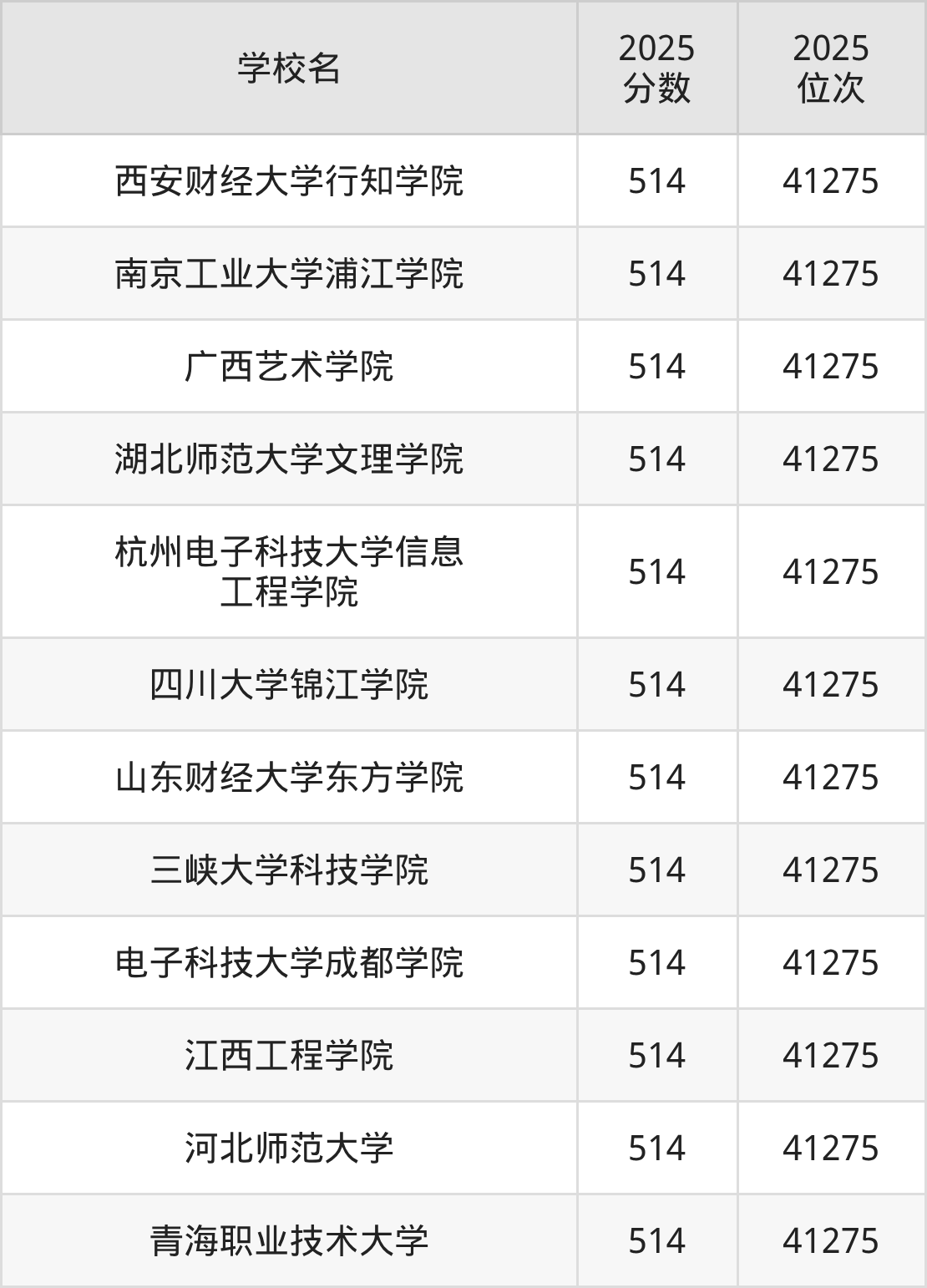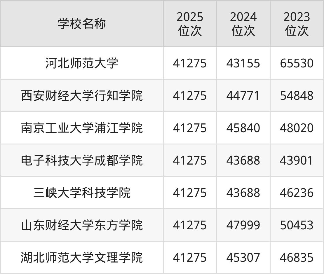 西安财经大学行知学院:2025年的最低分位次是41275名,2024年是44771名,2023年是54848名。招生专业包含:金融学、会计学。