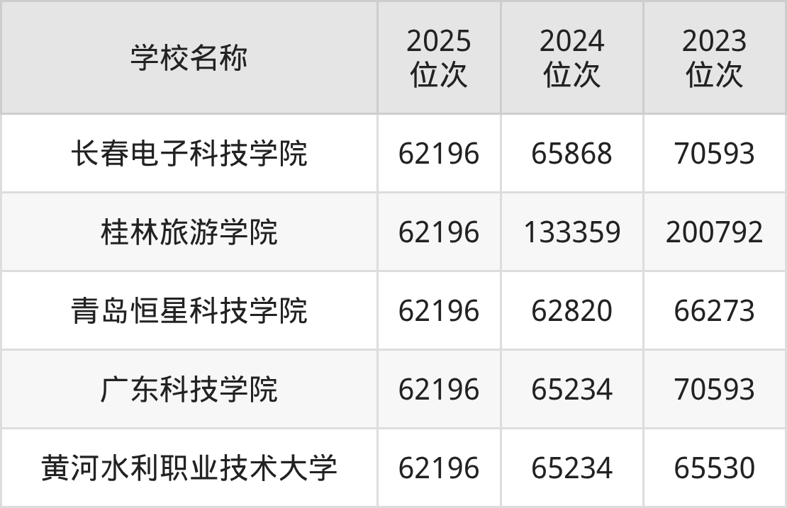 保底的大学:是从“较稳妥”院校中筛选近三年最低录取位次均稳定在62000名之后的院校,录取安全性高,可规避滑档风险。包含长春电子科技学院、桂林旅游学院、青岛恒星科技学院、广东科技学院、黄河水利职业技术大学。