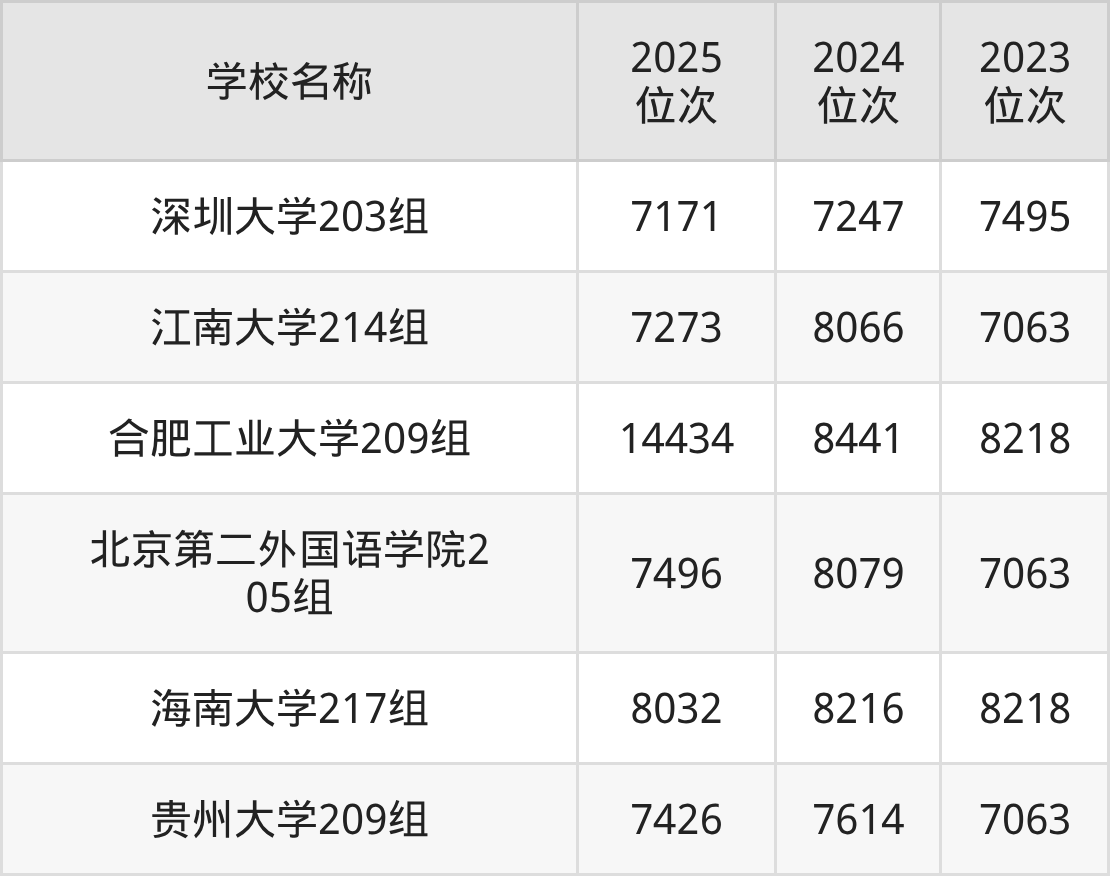深圳大学203组:2025年的最低分位次是7171名,2024年是7247名,2023年是7495名。招生专业包含:工商管理类、工商管理、金融学类、经济学、金融学。