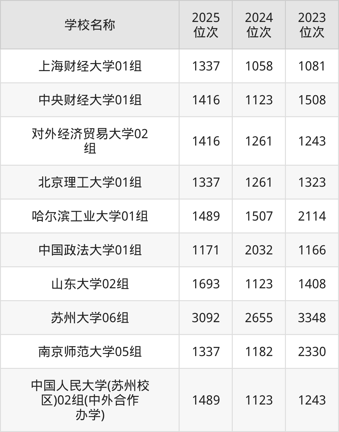 上海财经大学01组:2025年的最低分位次是1337名,2024年是1058名,2023年是1081名。招生专业包含:财务管理、会计学、审计学、金融学、工商管理类、经济学、法学、财政学类。