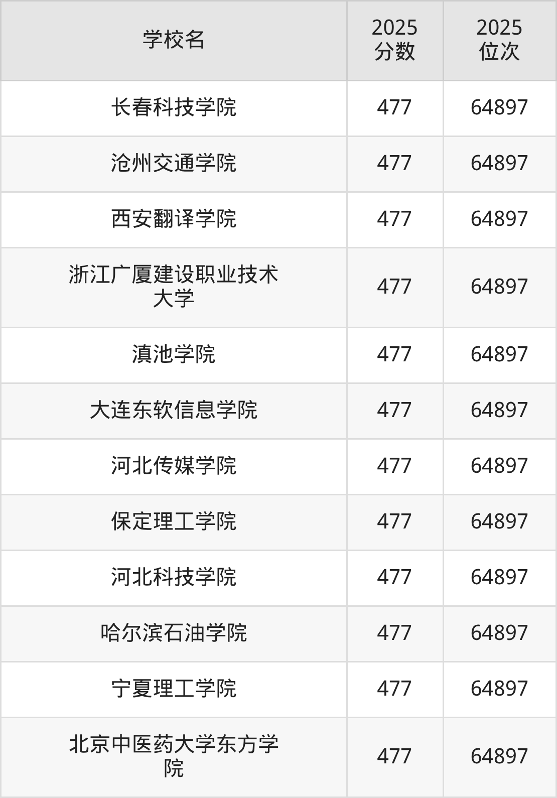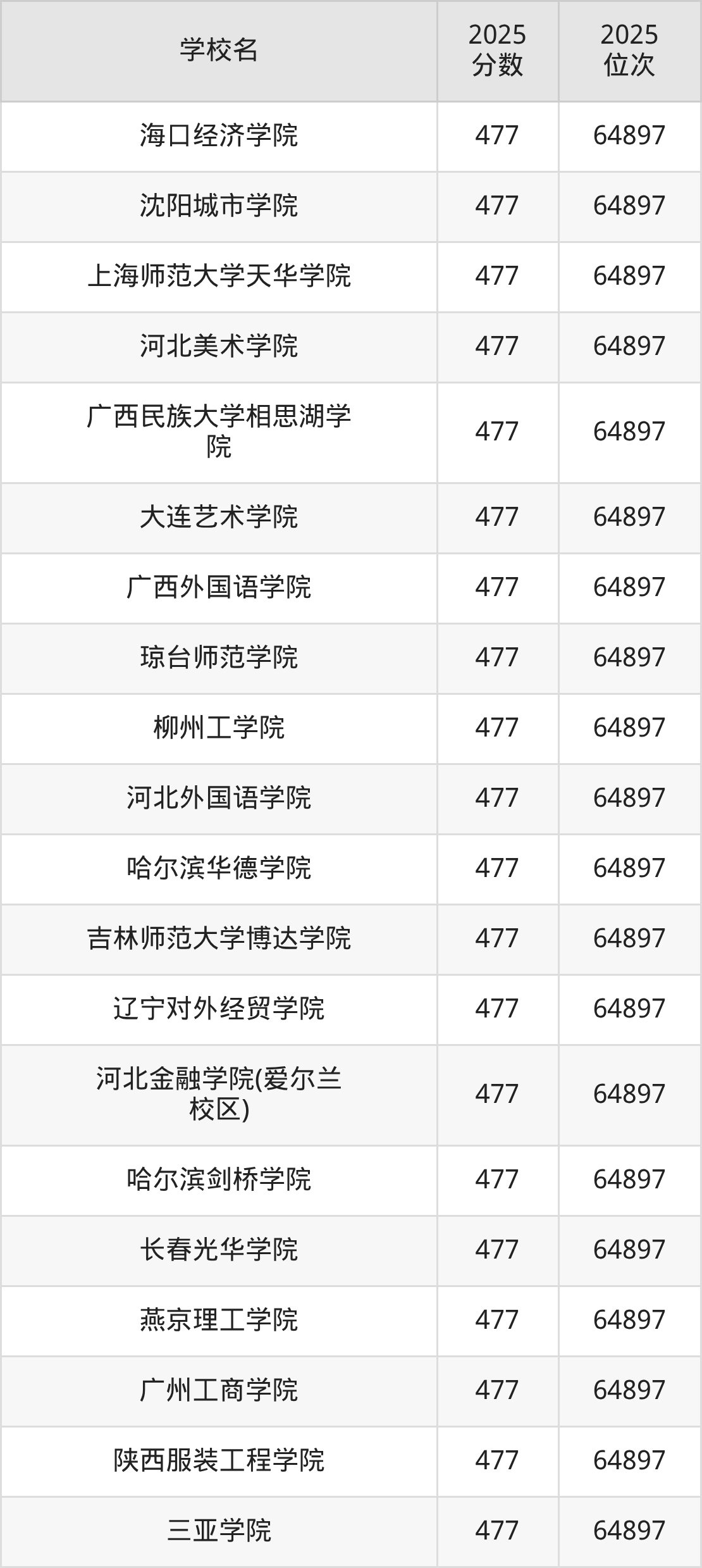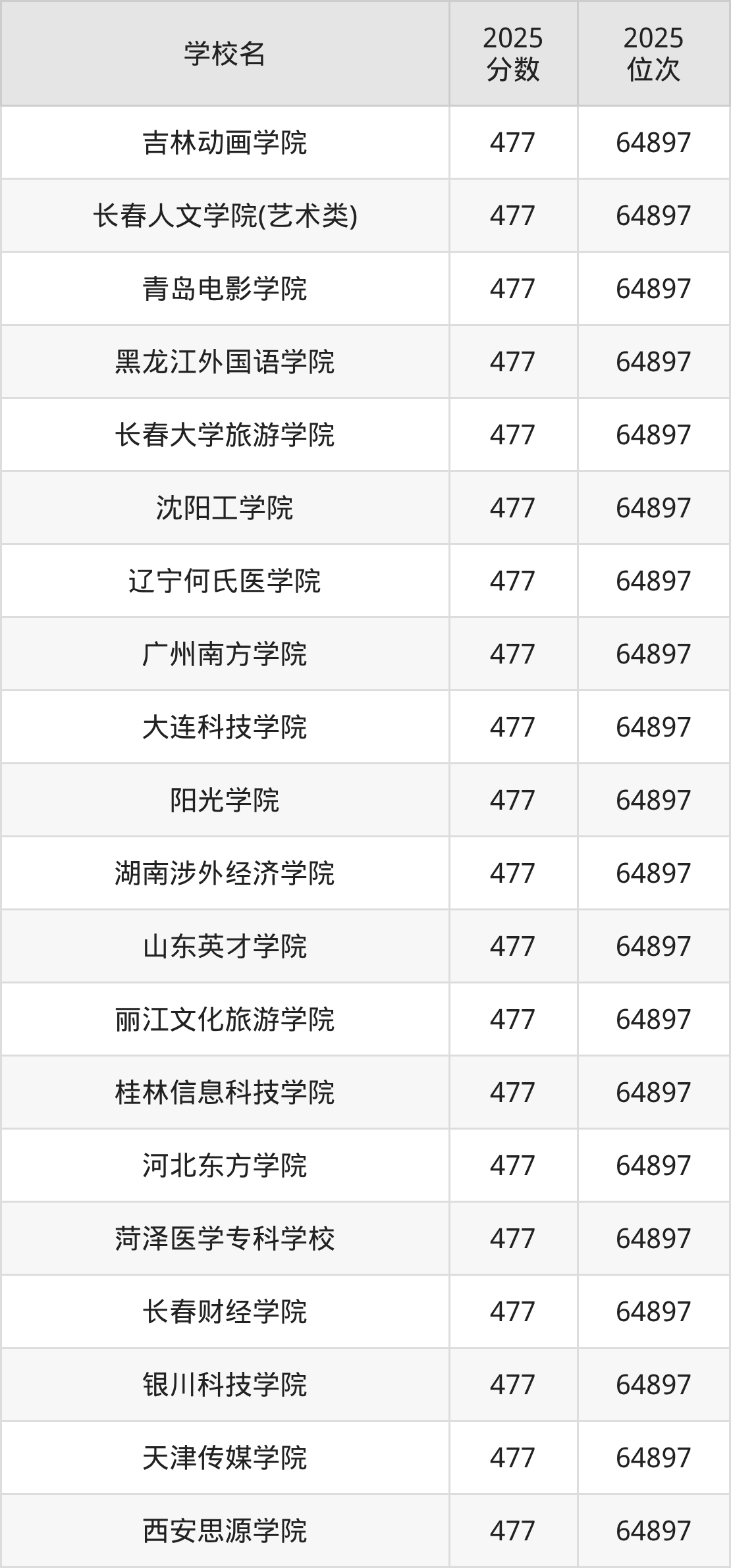包含:吉林动画学院、长春人文学院(艺术类)、青岛电影学院、黑龙江外国语学院、长春大学旅游学院、沈阳工学院、辽宁何氏医学院、广州南方学院、大连科技学院、阳光学院。