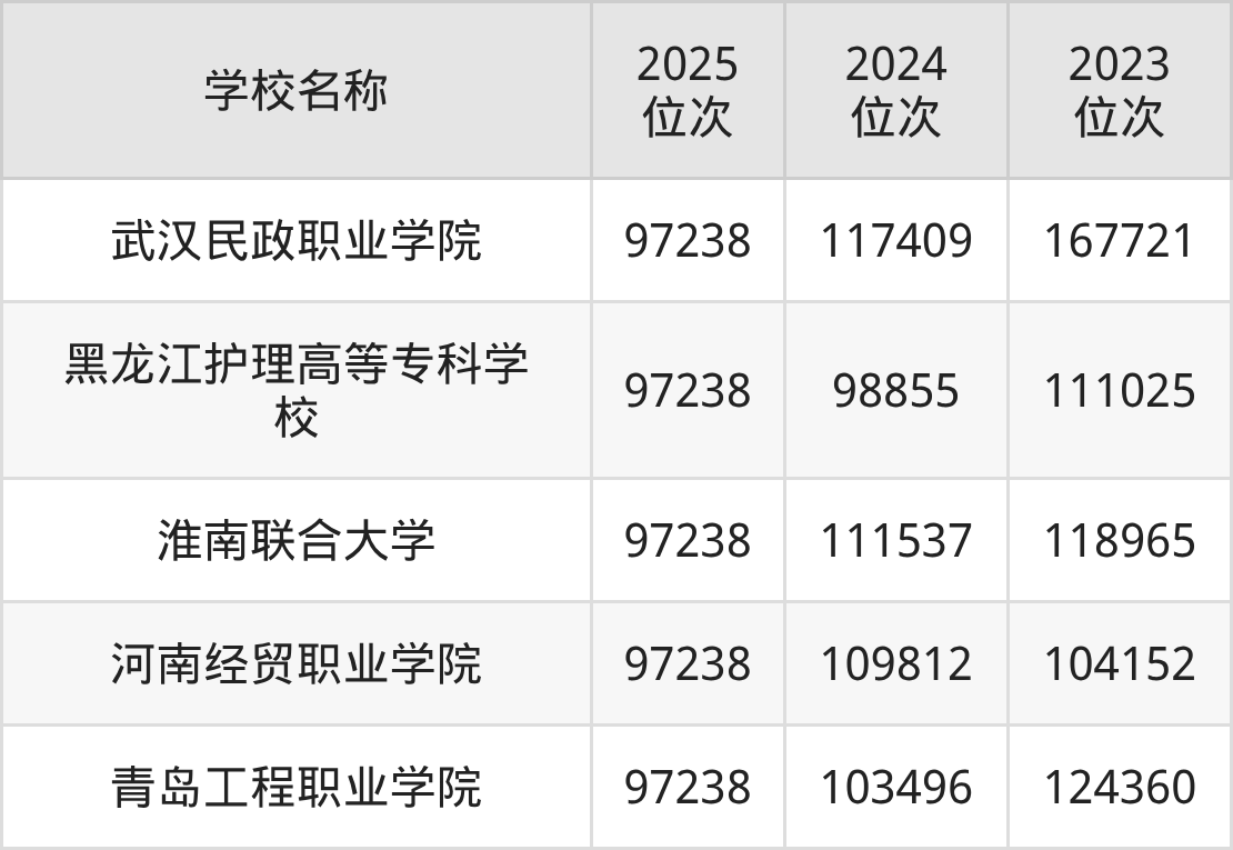 黑龙江护理高等专科学校:2025年的最低分位次是97238名,2024年是98855名,2023年是111025名。招生专业包含:临床医学、口腔医学、护理、药学、中医学、针灸推拿、医学检验技术、康复治疗技术。