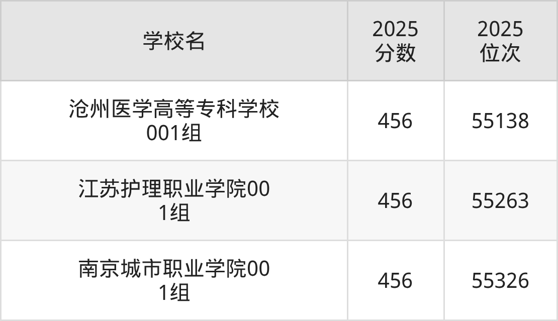 包含:沧州医学高等专科学校、江苏护理职业学院、南京城市职业学院。