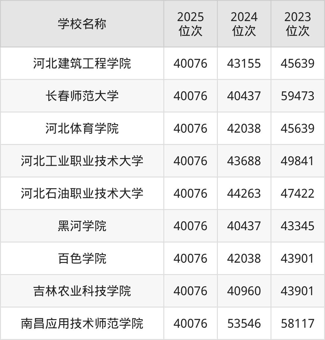 河北建筑工程学院:2025年的最低分位次是40076名,2024年是43155名,2023年是45639名。招生专业包含:英语、德语、建筑学、城乡规划、风景园林。