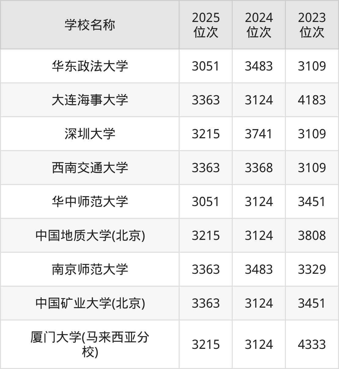 | 学校名称 | 2025 位次 | 2024 位次 | 2023 位次 |