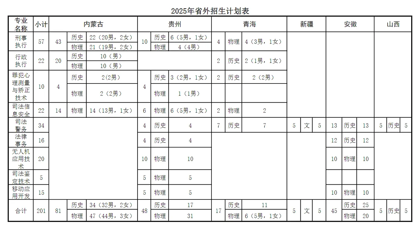 浙江警官职业学院(省外)2025年面向内蒙古、贵州等、青海、宁夏、新疆、安徽、山西招生,共招201人,招生专业包含了刑事执行、行政执行、罪犯心理测量与矫正技术、司法警务、司法信息安全 。