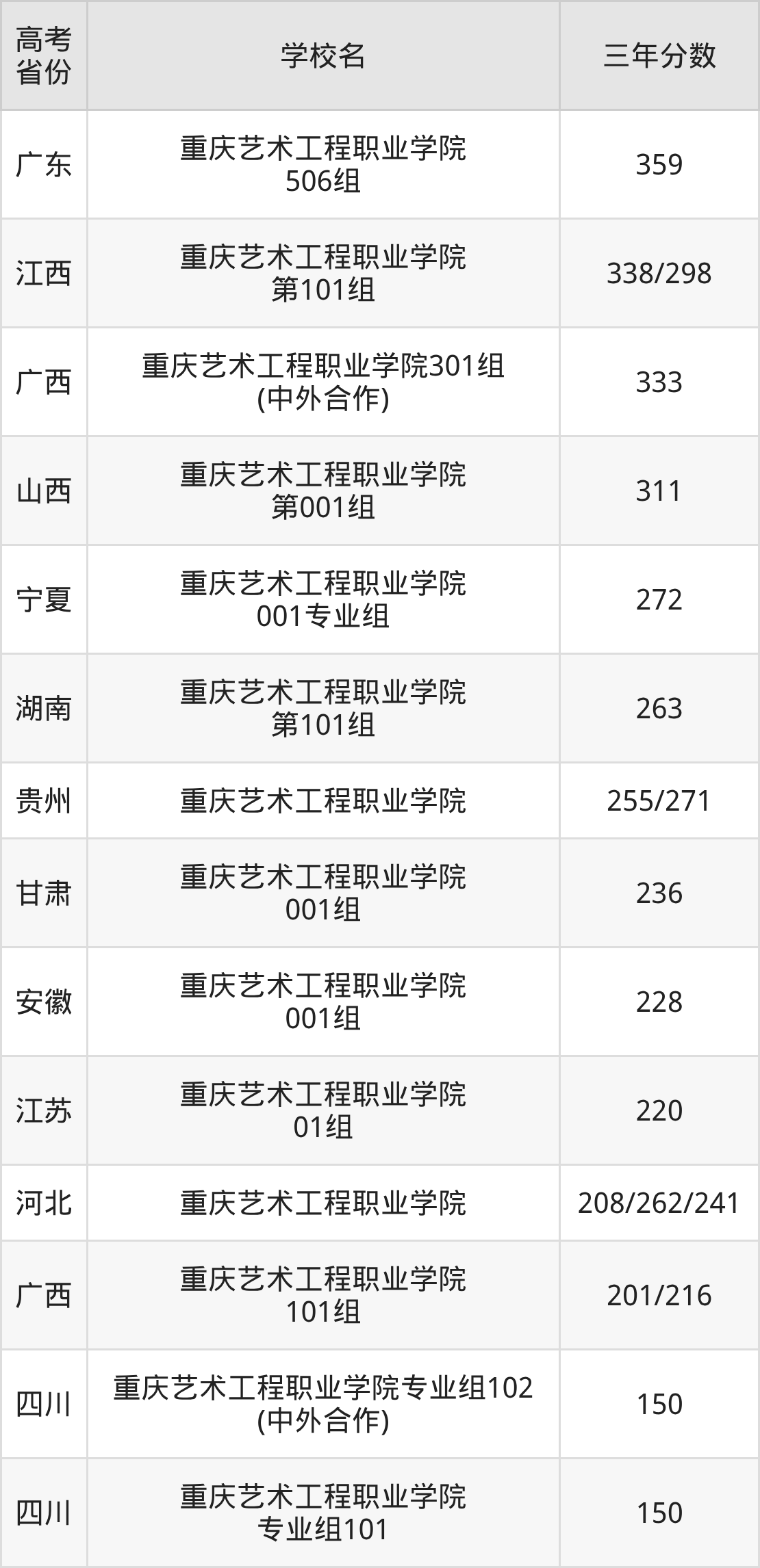 | 四川 | 重庆艺术工程职业学院 专业组101 | 150 |