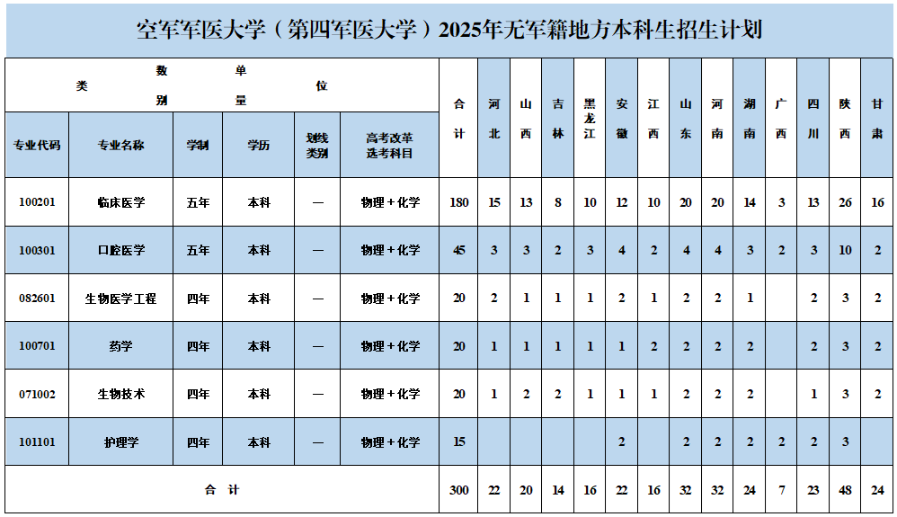 空军军医大学(无军籍地方本科生)2025年面向河北、山西、吉林等多个高考省市招生,共招生300人,招生专业包含了临床医学、口腔医学、生物医学工程、药学、生物技术、护理学 。
