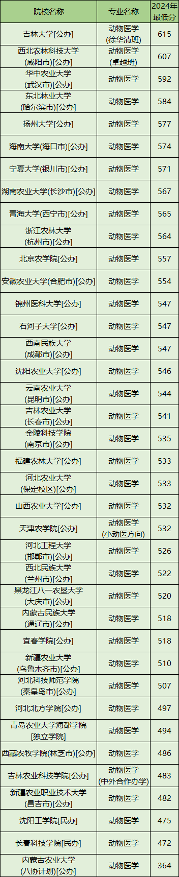 一、2024年各大学动物医学专业分数线
