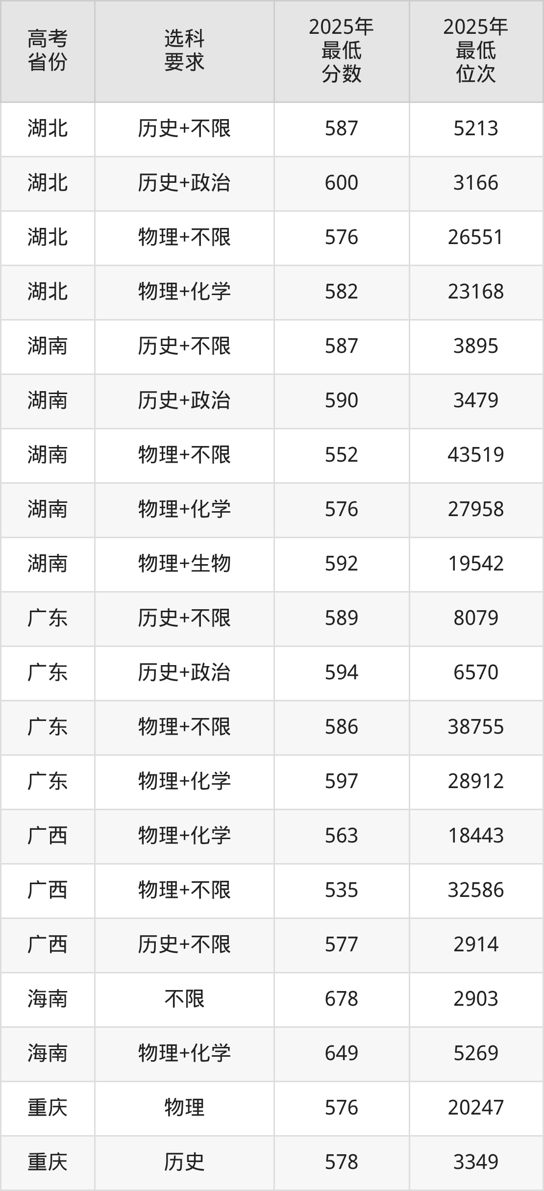 在2025年江苏高考物理类招生时,985收分最低的是湖南大学05组(边防军人子女预科班),最低分是587分、位次是47686位。再看江南大学,2025年在江苏物理类的最低录取分数线是587分,最低位次是47686位。