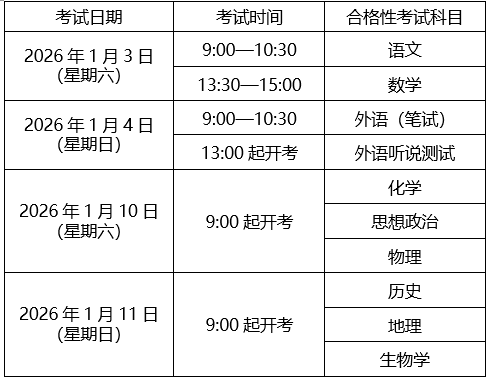 2026年上海市普通高中学业水平考试安排正式出炉。全年考试分两个主要时段:2026年1月主要进行语文、数学、外语合格考及部分科目的补考;5月上旬进行等级性考试;6月进行另一次合格性考试。