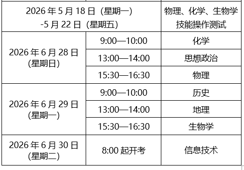 预计5月上旬举行,具体日期待2026年全国法定节假日安排公布后确定。考试科目为思想政治、历史、地理、物理、化学、生物学。