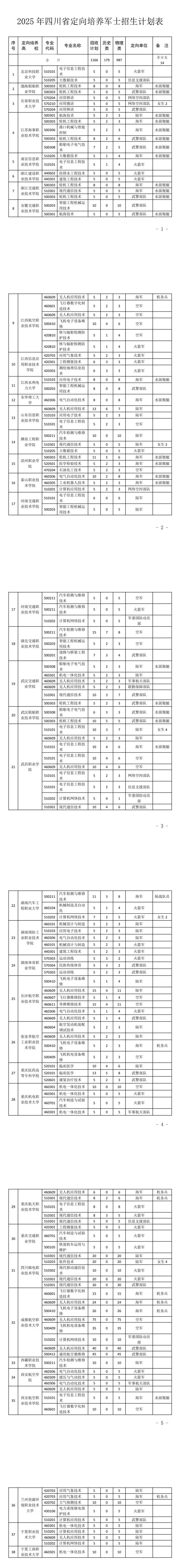 2025年四川定向士官总计划招生1166人(含女军士14人),较2024年(1274人)减少108人。分科类计划如下:
