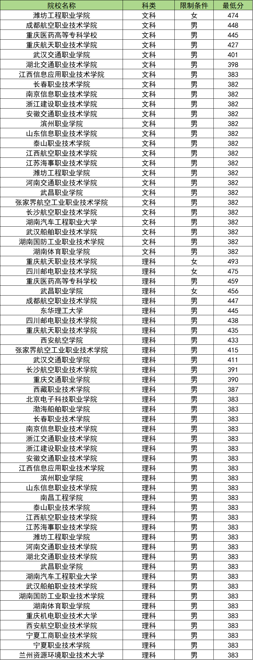 文科男生:最低分382分(10所院校),最高分448分(成都航空职业技术学院);