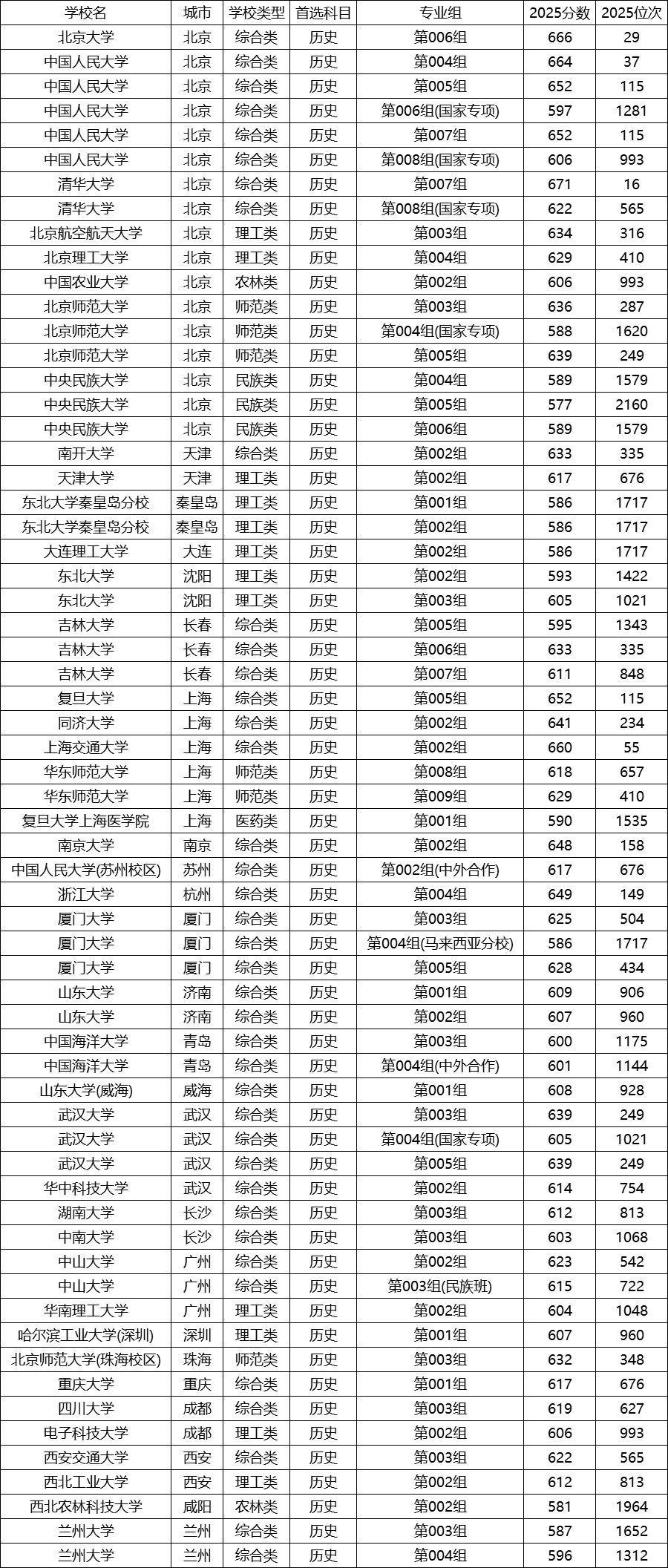 总体情况历史类考生上985的最低分为577分,来自中央民族大学(位次2160名)。常规批次最低分数在586分左右(如东北大学秦皇岛分校)。分数范围从577分至671分,院校层次分明,文史强校分数偏高。