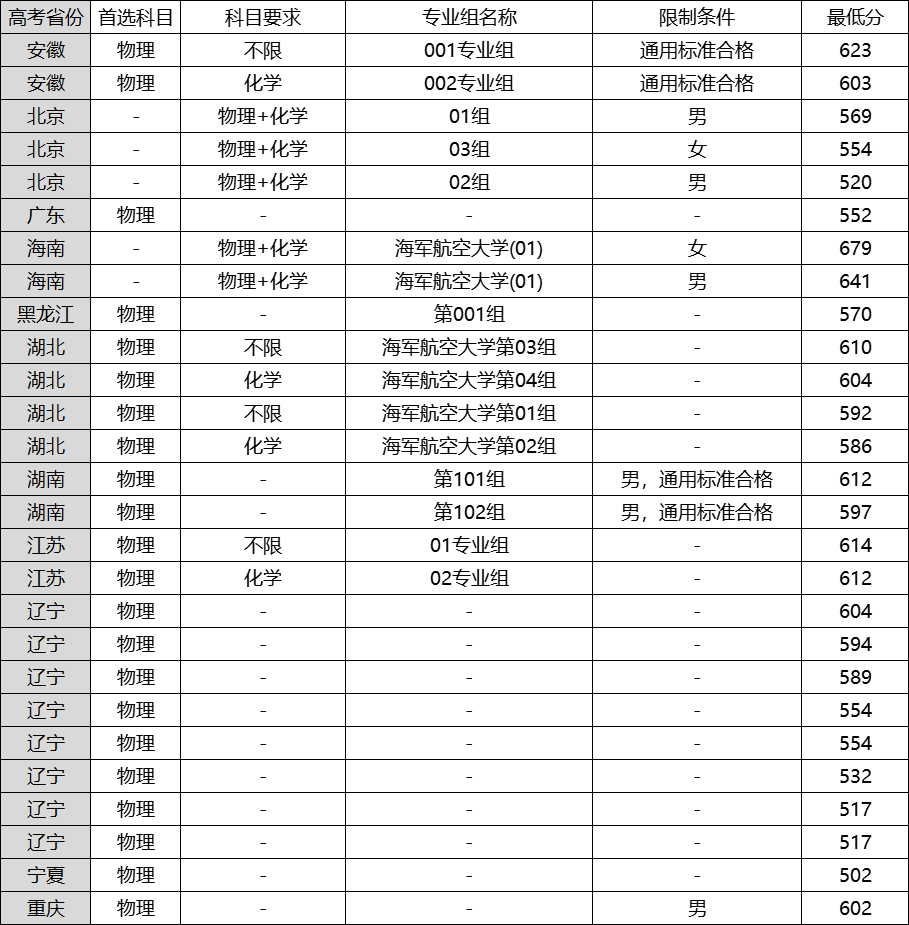 竞争激烈,分数要求高:海军航空大学作为海军飞行与岸防人才的摇篮,普通军队专业组录取最低分普遍在600分以上,热门省份如海南、安徽、江苏等地均超过610分。