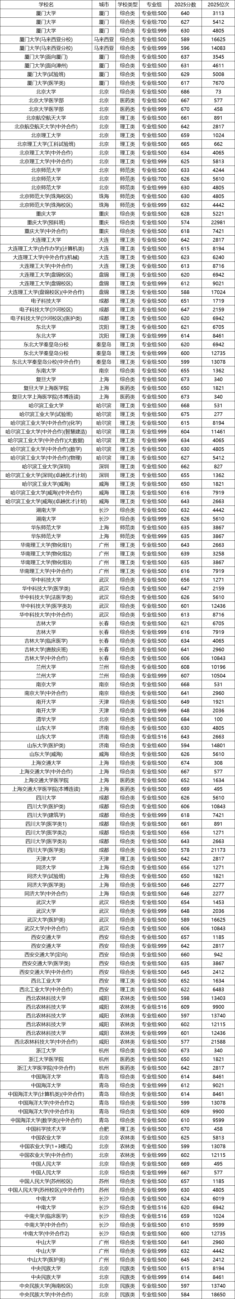 中间梯队院校分数集中在620分至670分之间,包括华中科技大学、武汉大学、西安交通大学、哈尔滨工业大学等。