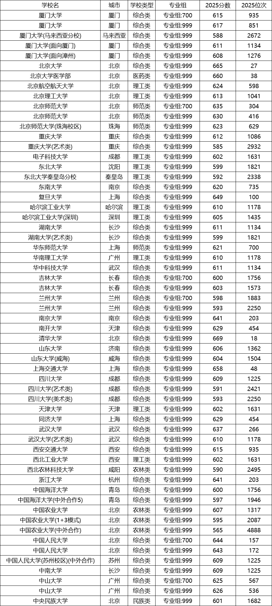在历史类中,福建省内985高校是厦门大学。2025年,其历史类投档线较为集中,多个专业组的分数从608分至617分不等。