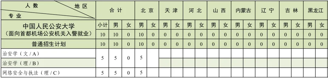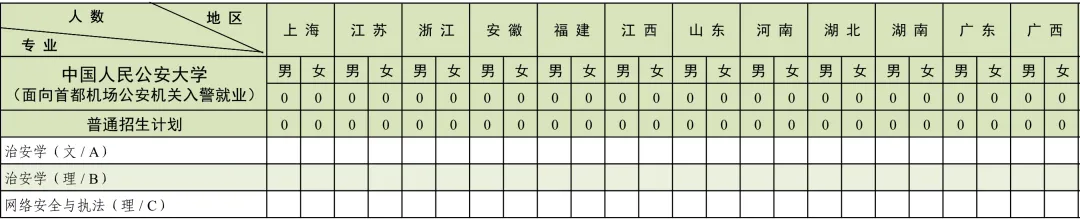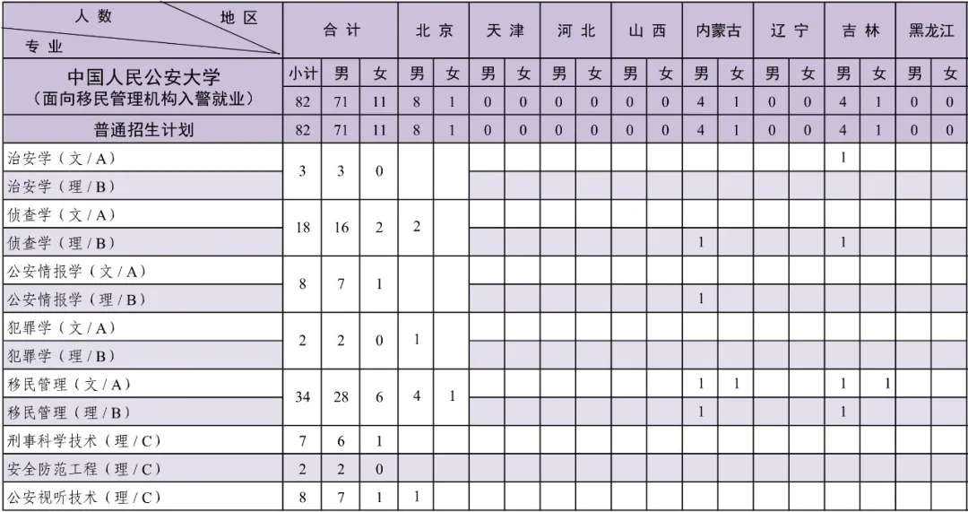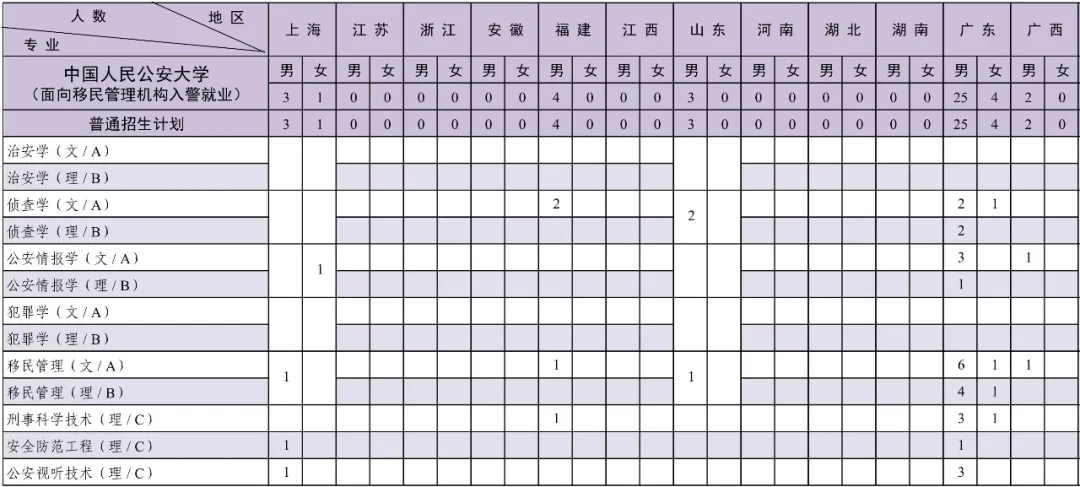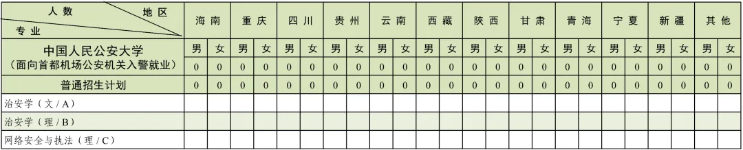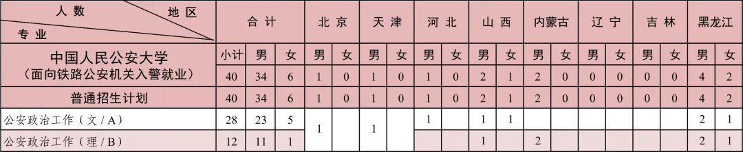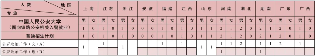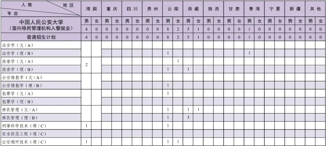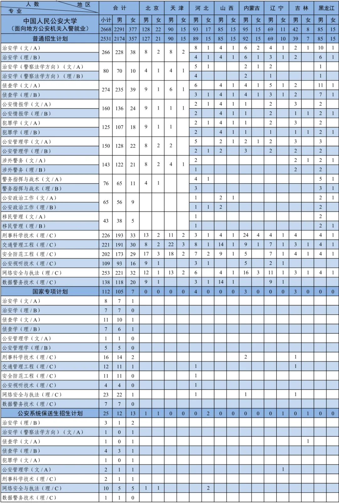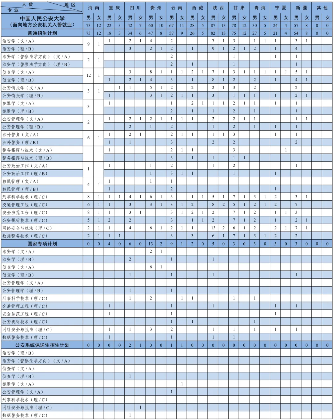 5、新疆计划中含南疆单列计划 2 人,均为男生,具体为犯罪学(理)1 人、公安政治工作(文)1 人。