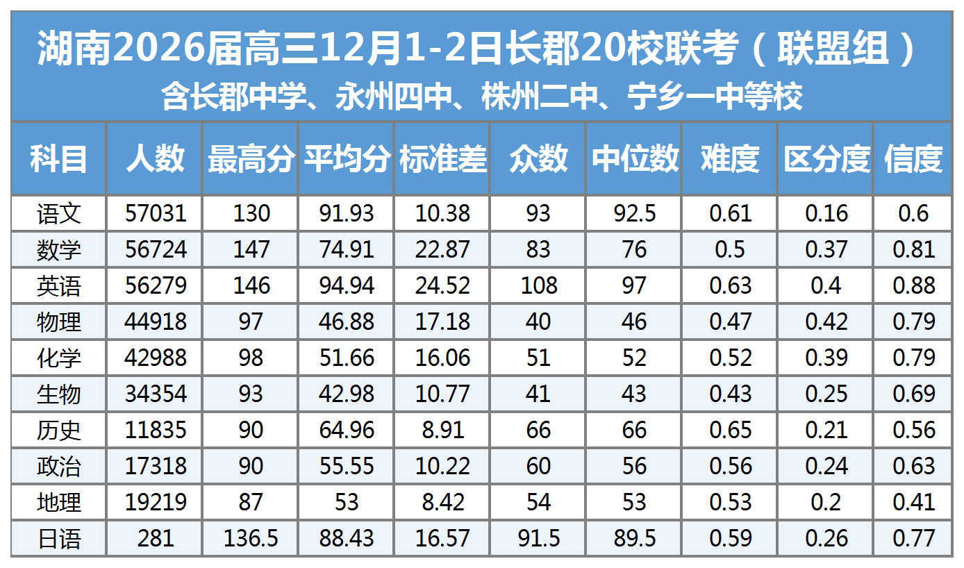2026湖南新高考长郡二十校联盟(含长郡中学、永州四中、株洲二中等校)高三12月1-2日联考已结束。本文将为大家解析2026届长郡二十校联盟高三12月联考的分数线和各科划线数据,帮助大家了解本次联考的整体难度,为接下来的复习提供清晰的方向。