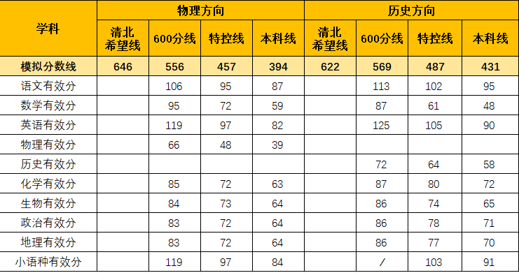 历史类:清北参考线622分,600分参考线569分,特控线487分,本科线431分。