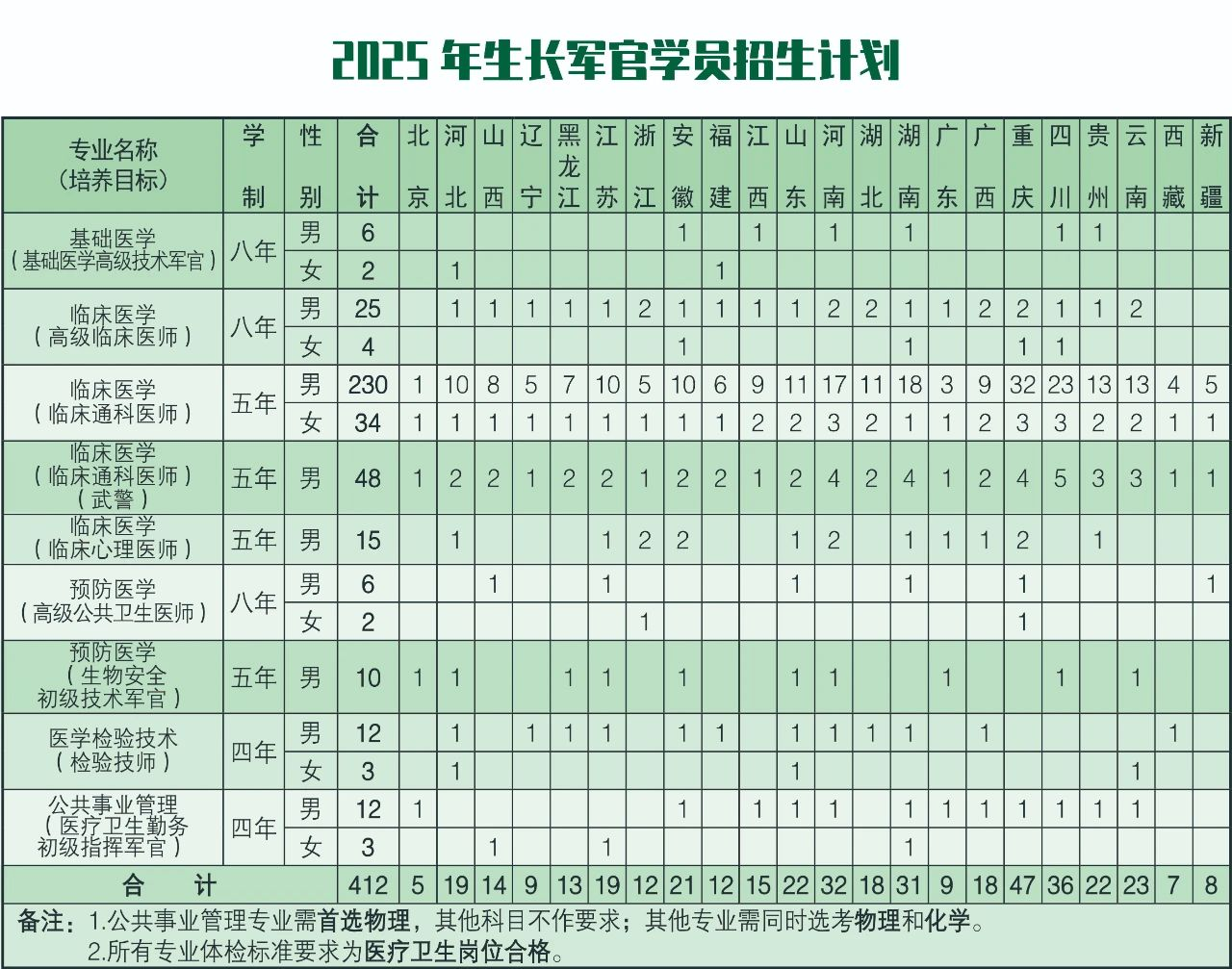 陆军军医大学2025年面向北京、河北、山西等多个高考省市招生,共招生412人,其中364位男生、48位女生,招生专业包含了基础医学、临床医学、预防医学、医学检验技术、公共事业管理。