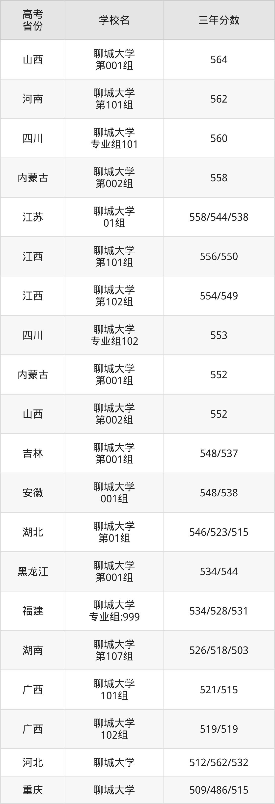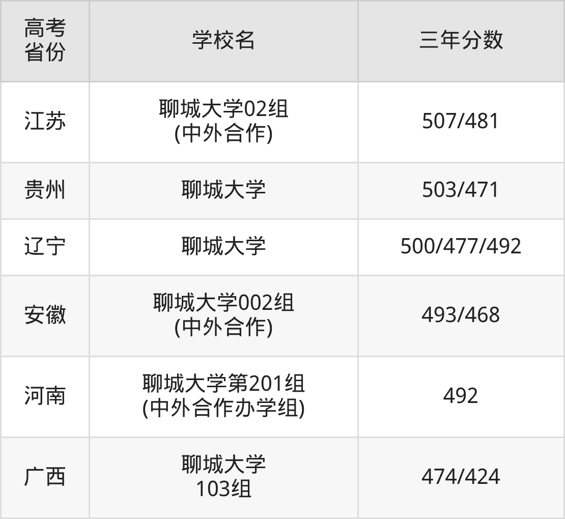 下方表格展示的是聊城大学在山东考生中招生时,近三年的最低录取分数线汇总: