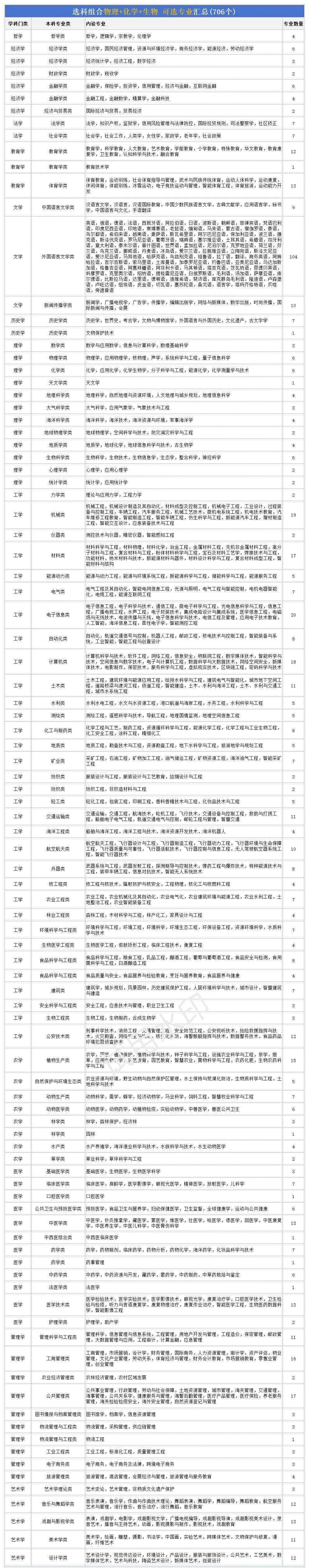 根据最新政策,物化生组合可报考的本科专业多达700多个,涵盖13个学科门类,包括理学、工学、医学、农学、经济学、法学、管理学、教育学、文学、艺术学等。这种选科组合的最大优势,就是专业适应性强,未来发展方向多样化。