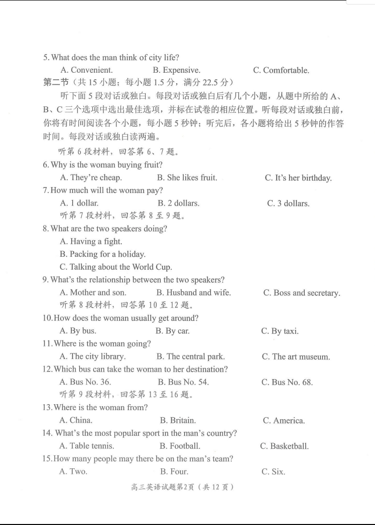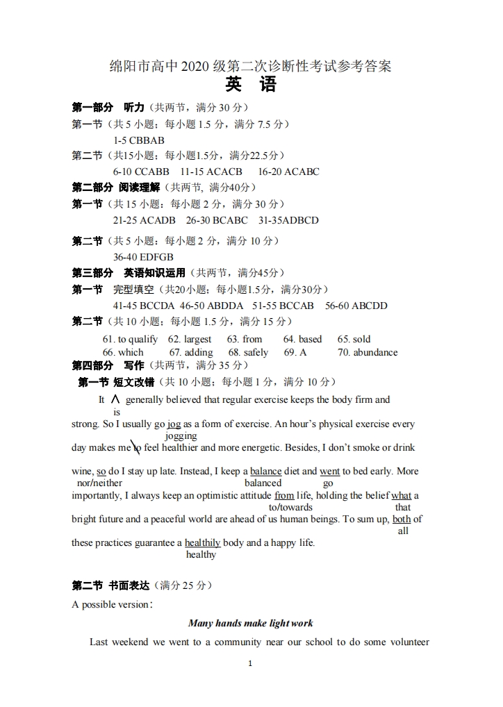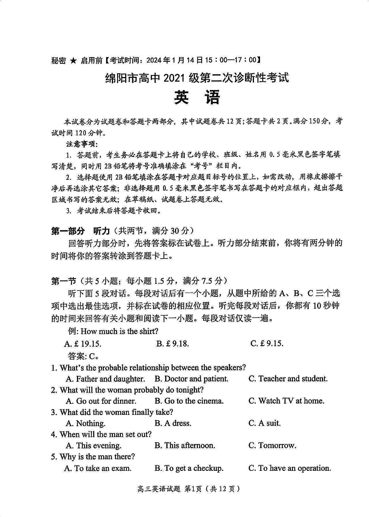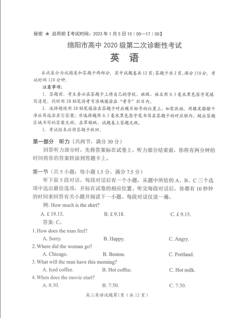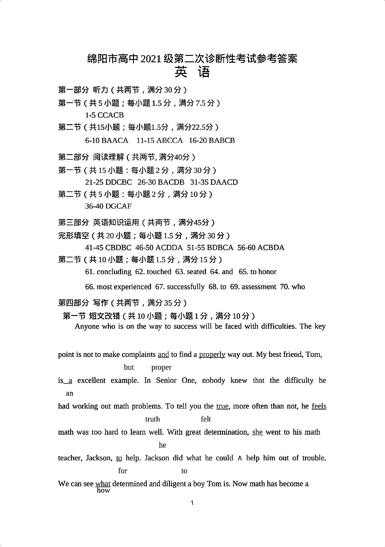 2026绵阳二诊英语试题及答案还未公布,以下是往年试题及答案!