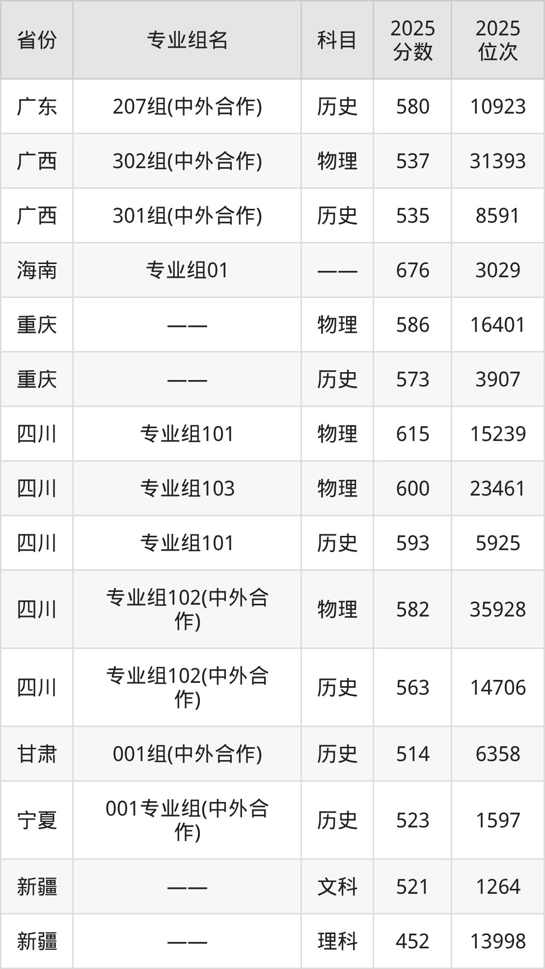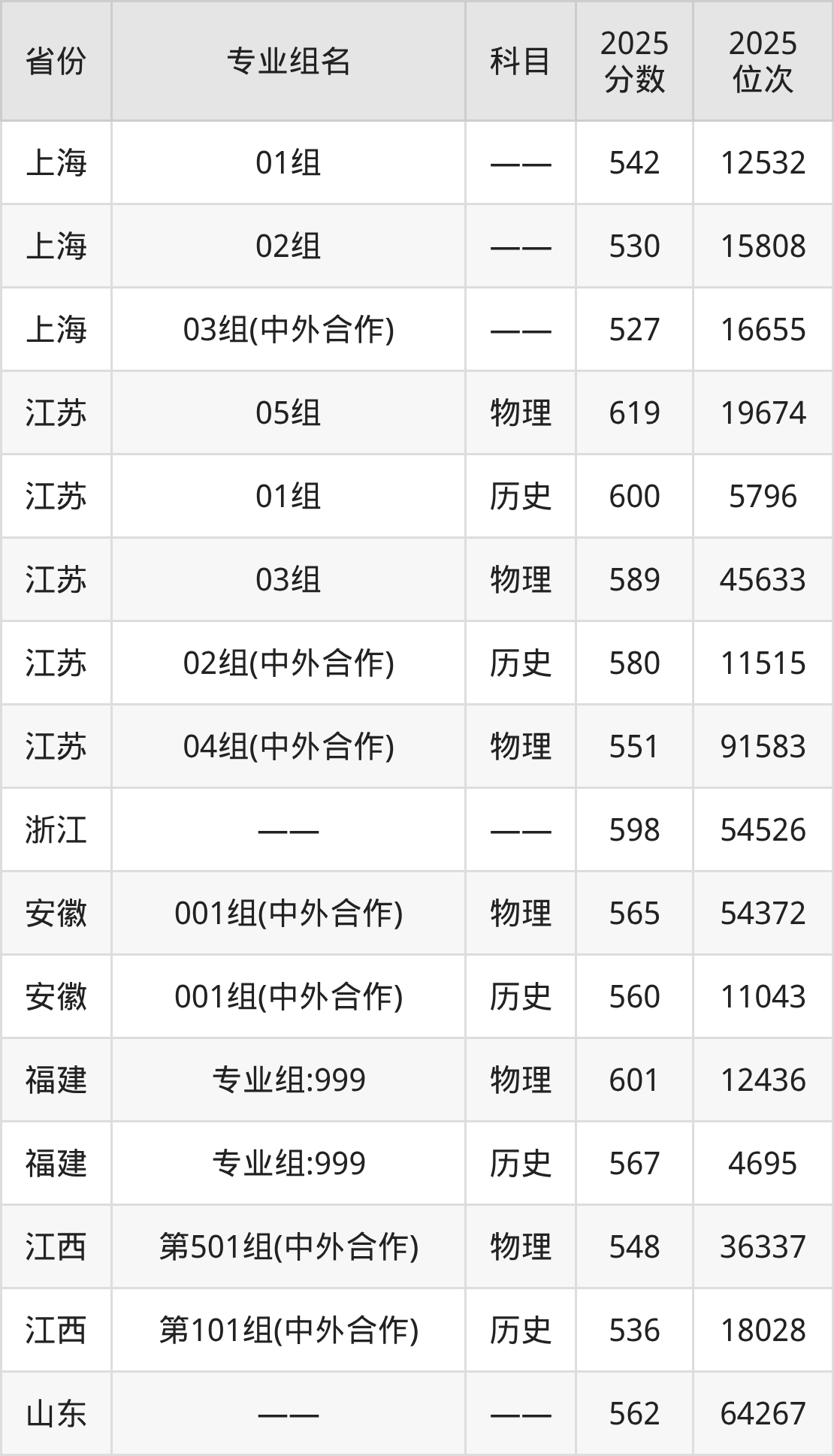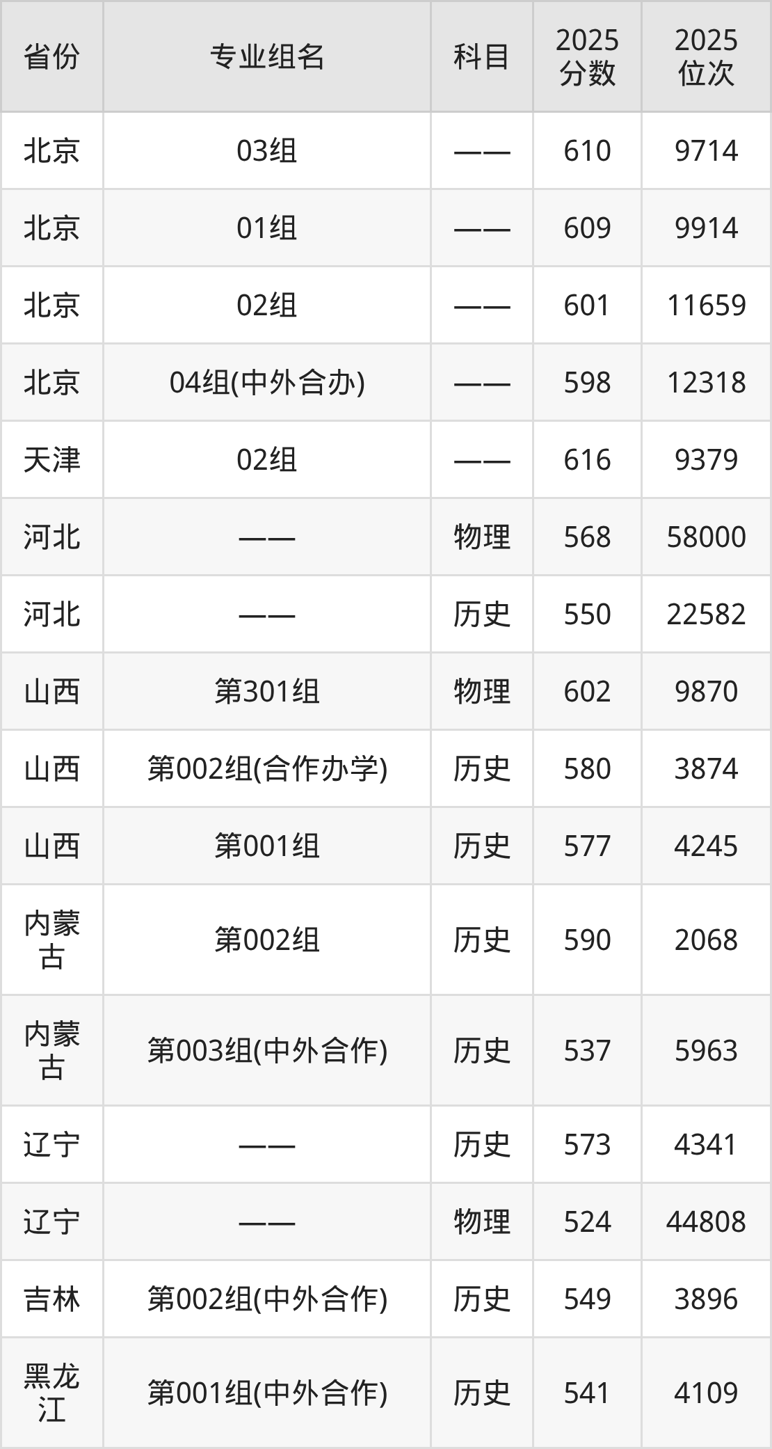 03组 610分、01组 609分、02组 601分、04组(中外合办) 598分。