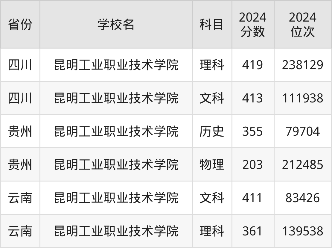 由于全国数据较多,因此本文仅展示昆明工业职业技术学院省内近三年录取分数线汇总。