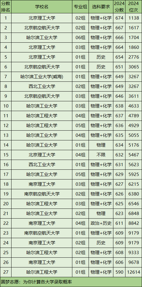由于上海高考是按“专业组模式”录取,所以下文展示的是:全国各个国防七子大学的专业组的录取分数线排名。