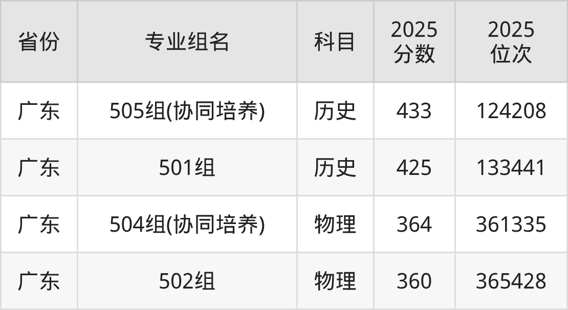 2025年广东体育职业技术学院在广东省内录取最低分数线是360分,录取最低的是物理类502组;录取分数线最高是433分,对应的是历史类505组(协同培养)。