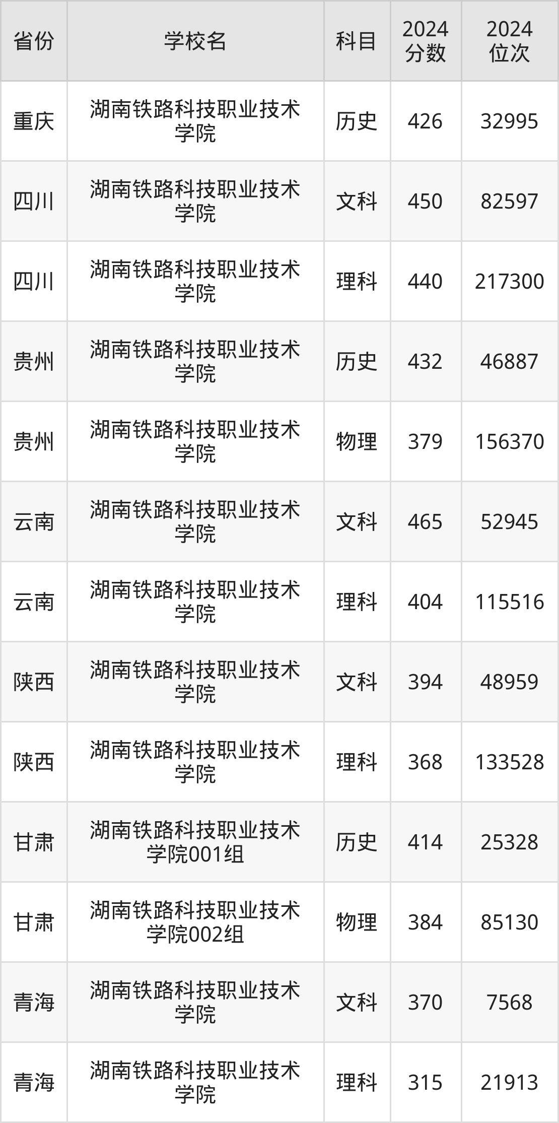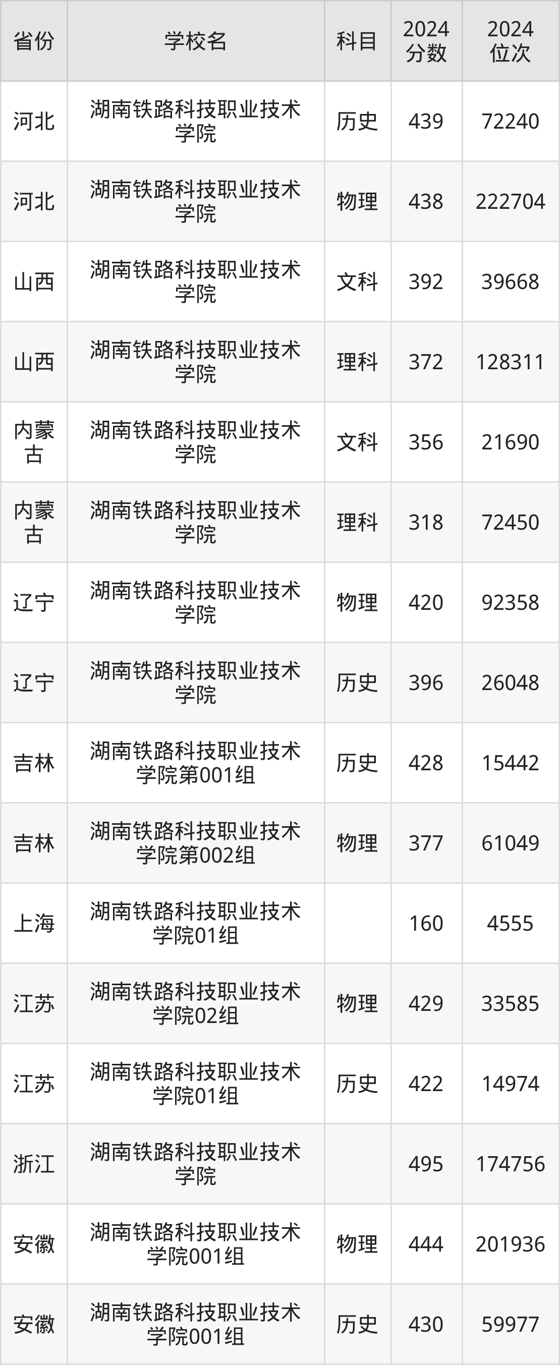 由于全国数据较多,因此本文仅展示湖南铁路科技职业技术学院省内近三年录取分数线汇总。