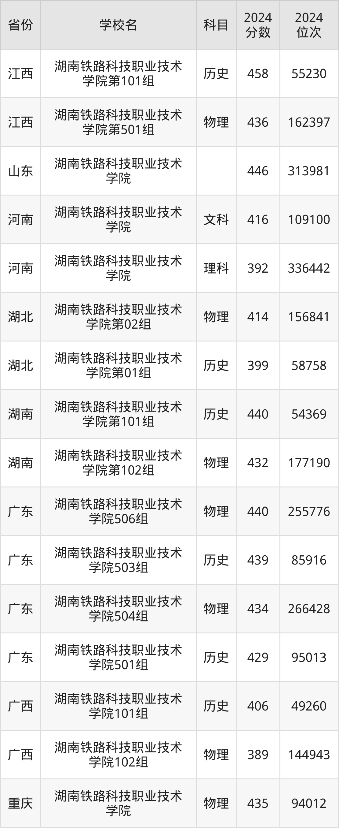 2024年湖南铁路科技职业技术学院在湖南省内录取最低分数线是432分,录取最低的是物理类第102组;录取分数线最高是440分,对应的是历史类第101组。