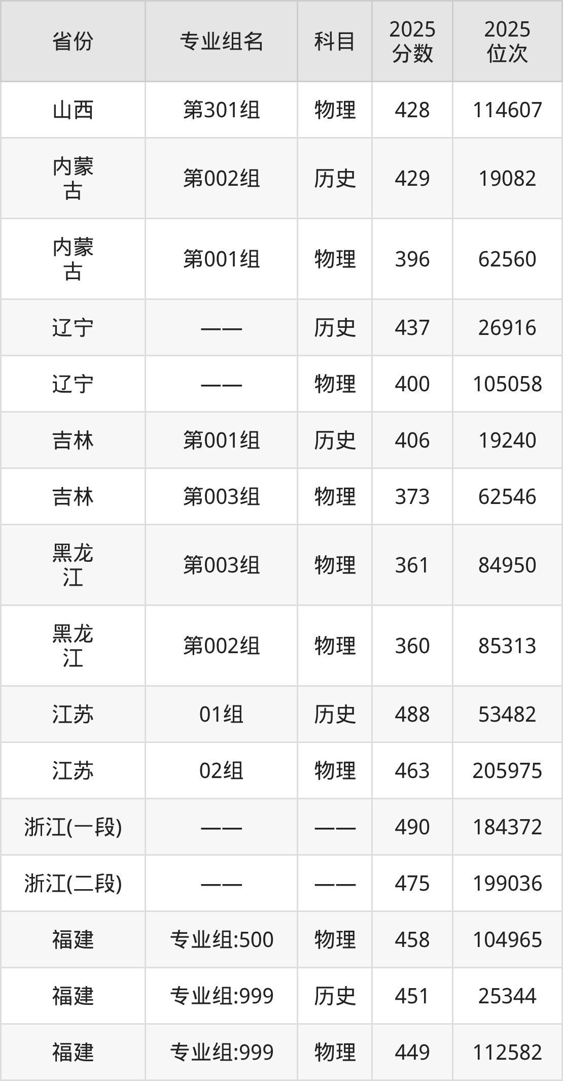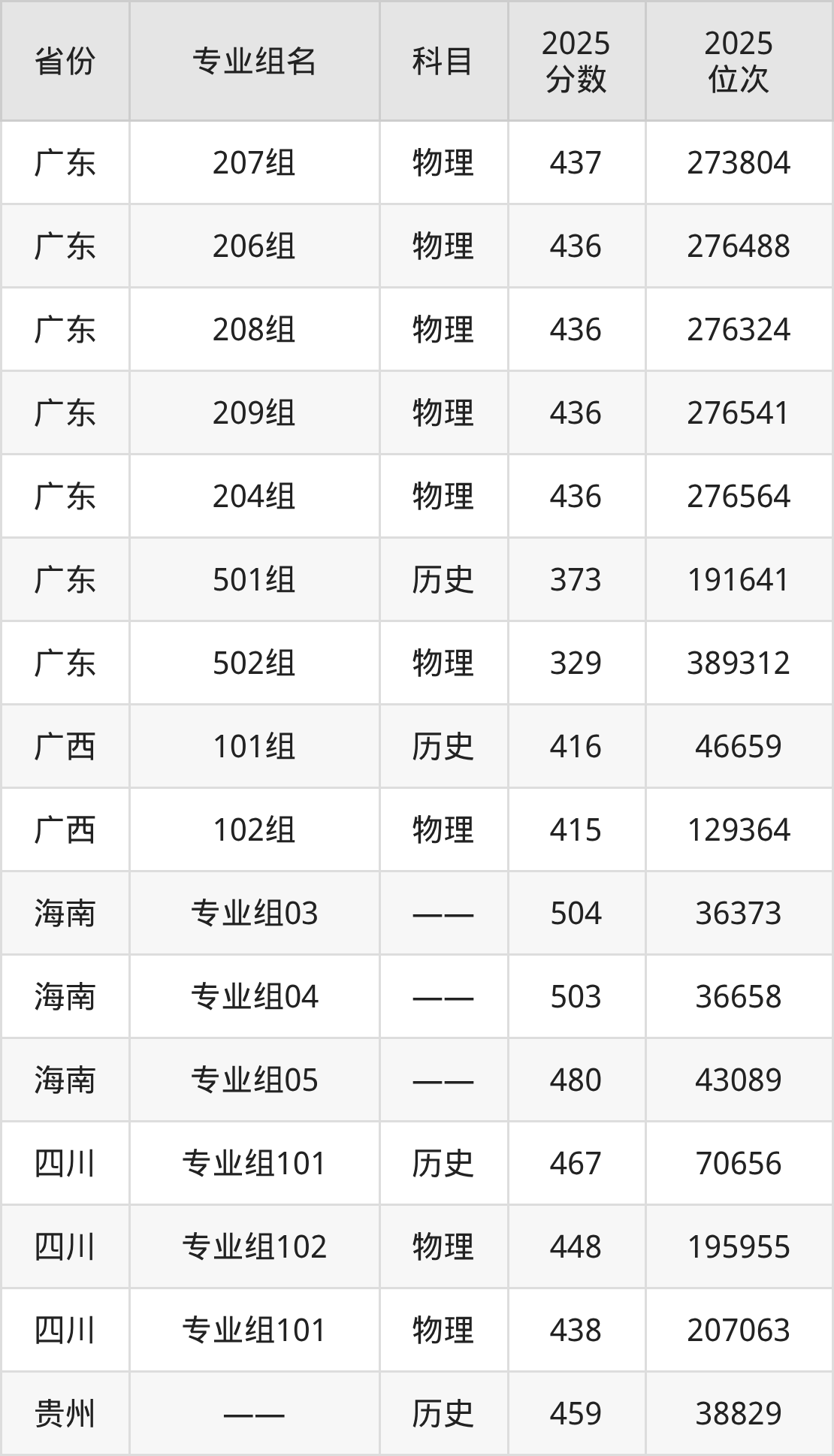 物理类:201组 437分、203组 437分、202组 435分、501组 397分。