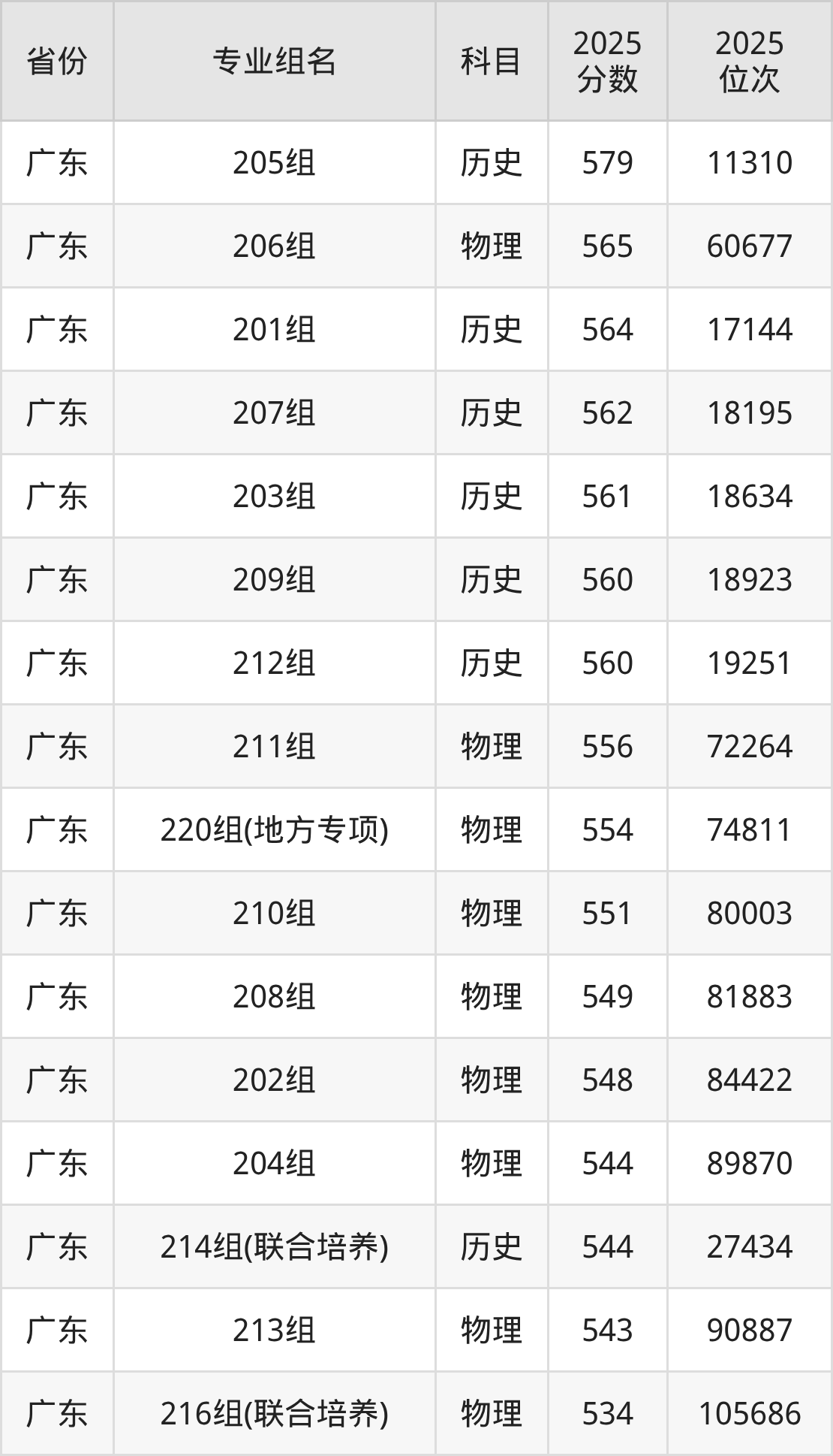 物理类:206组 565分、211组 556分、220组(地方专项) 554分、210组 551分、208组 549分、202组 548分、204组 544分、213组 543分、216组(联合培养) 534分、215组(联合培养) 533分(篇幅有限,仅展示10条数据)。