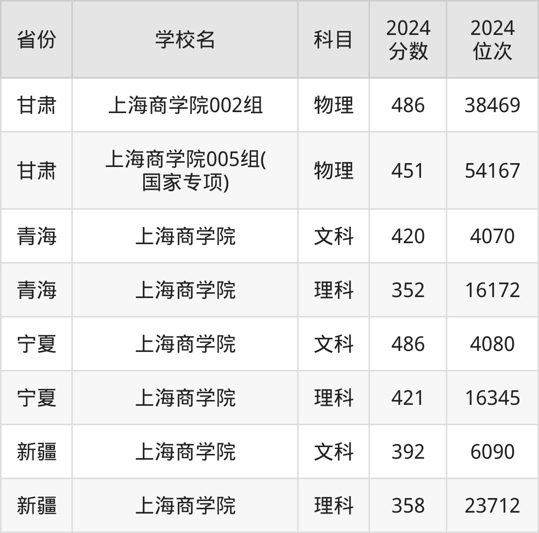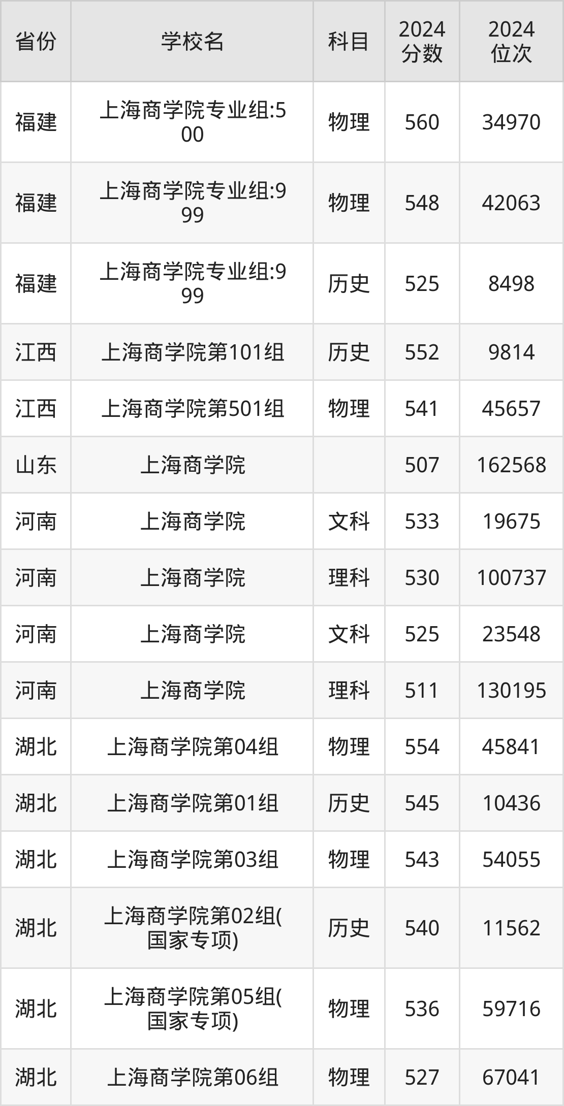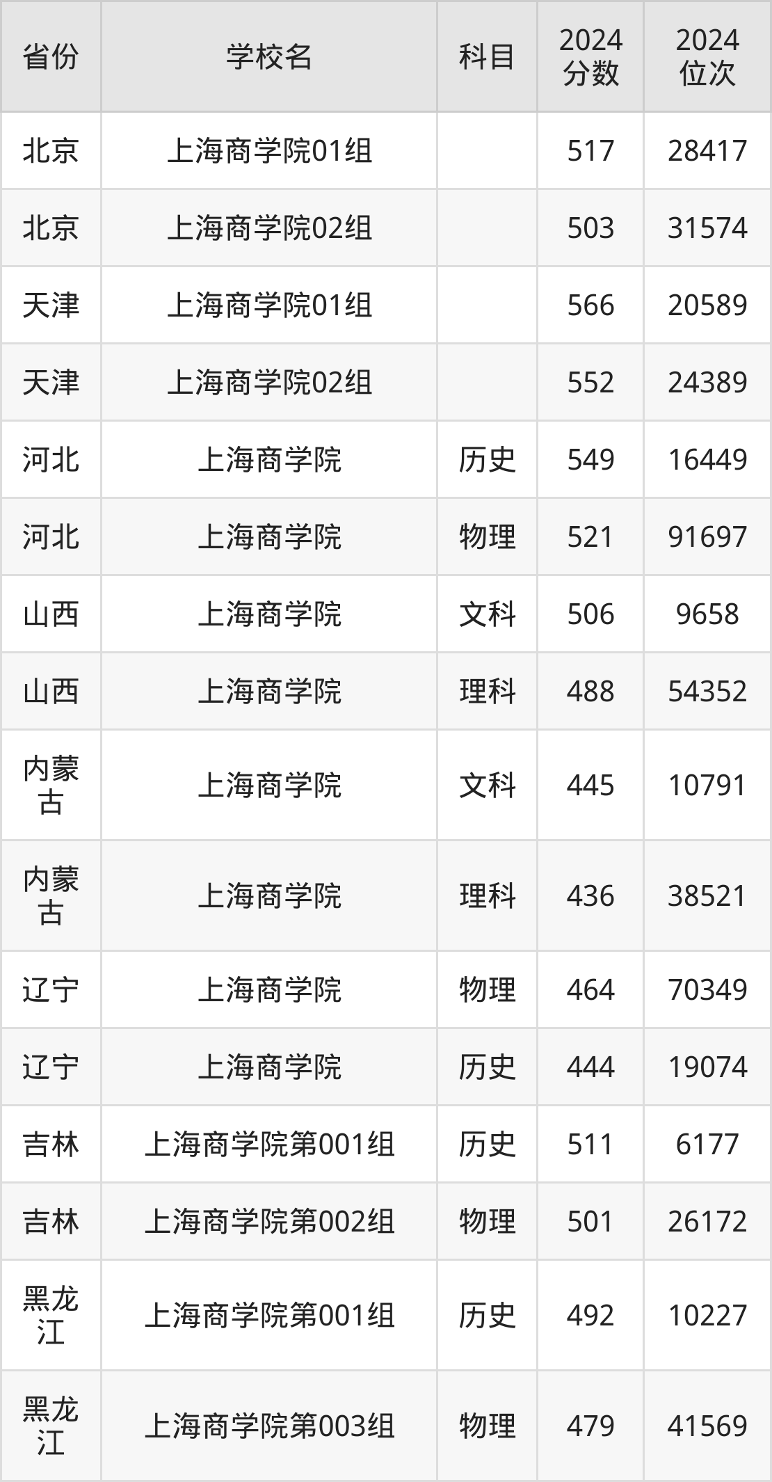 由于全国数据较多,因此本文仅展示上海商学院市内近三年录取分数线汇总。