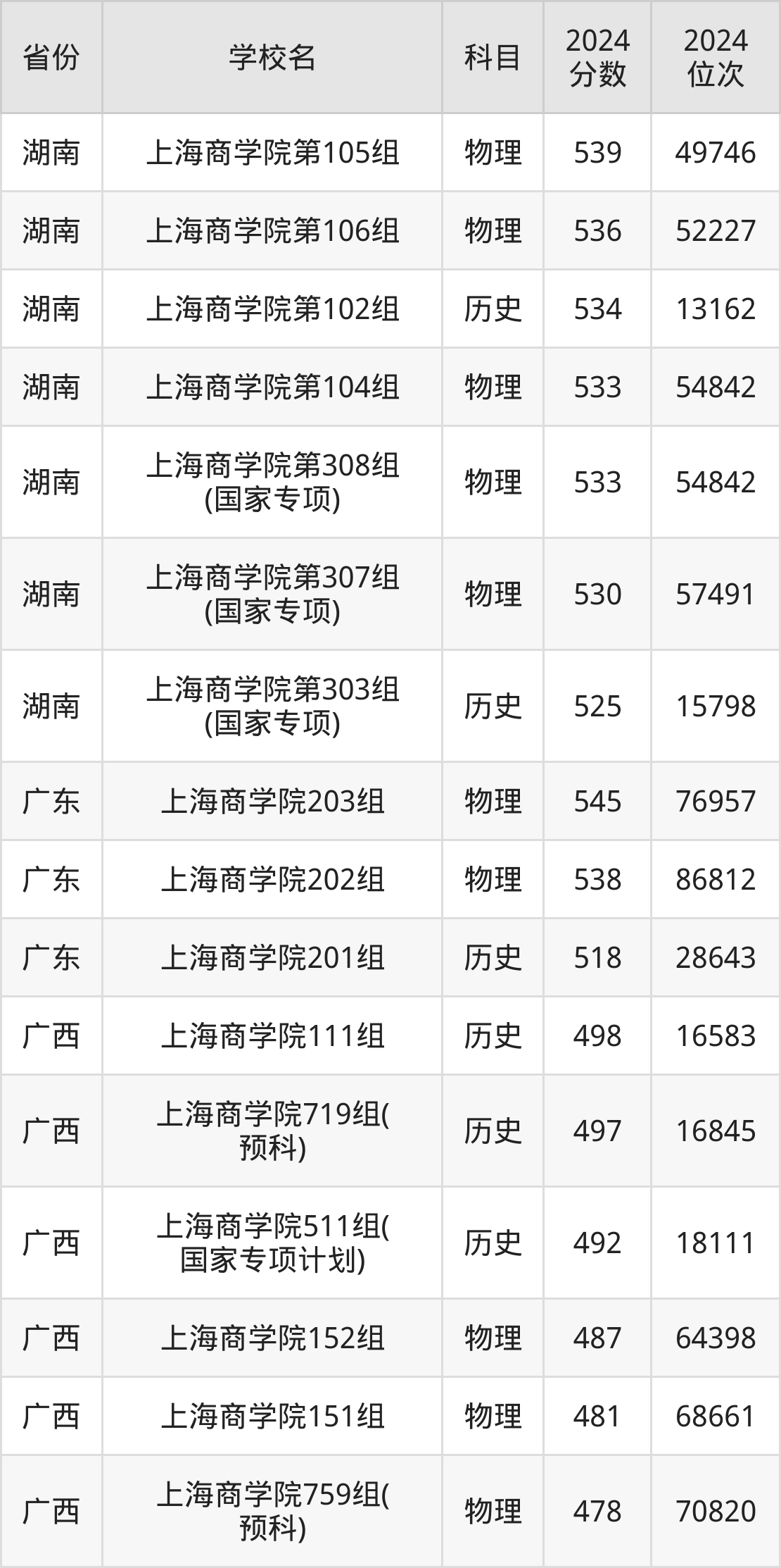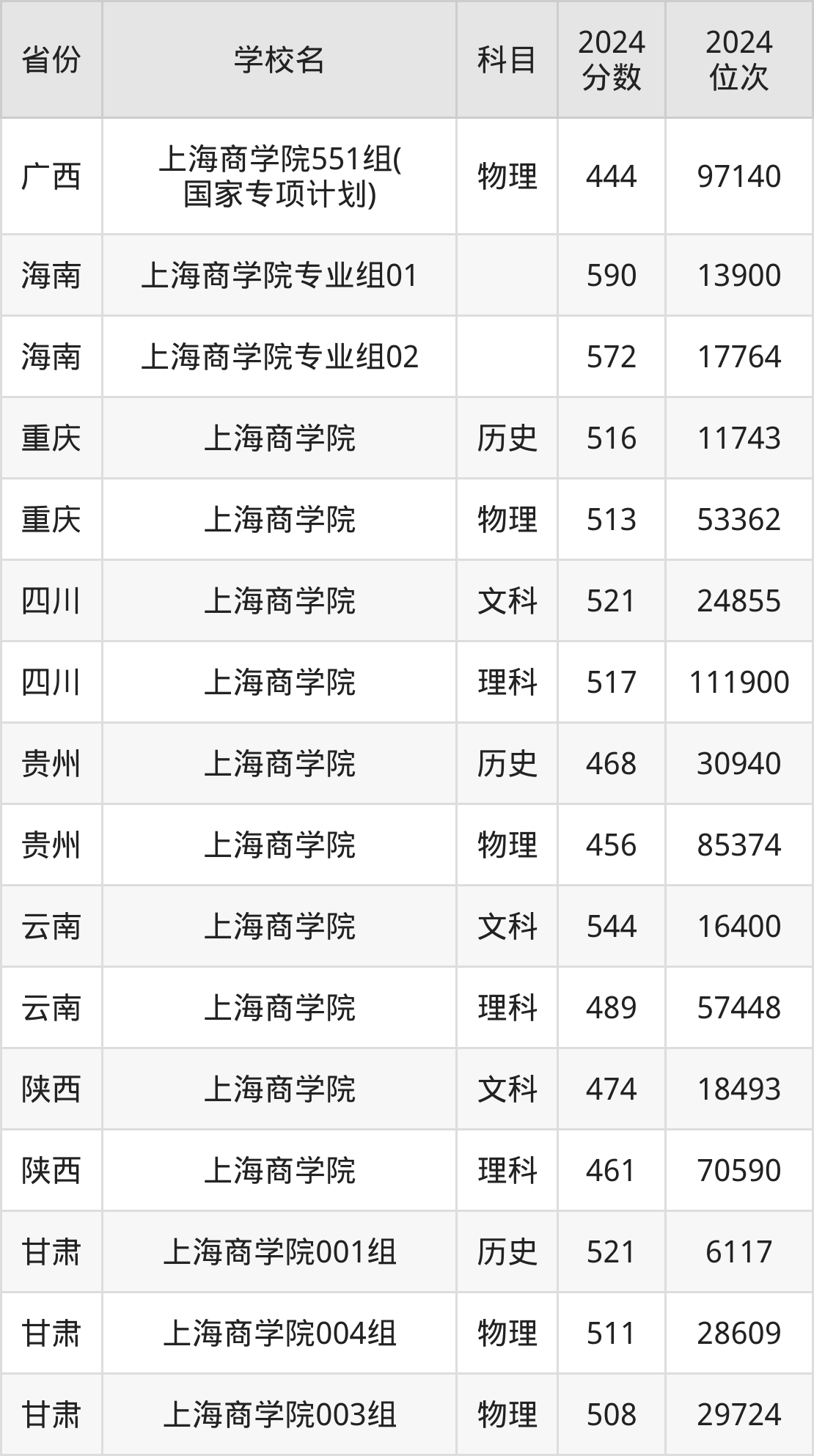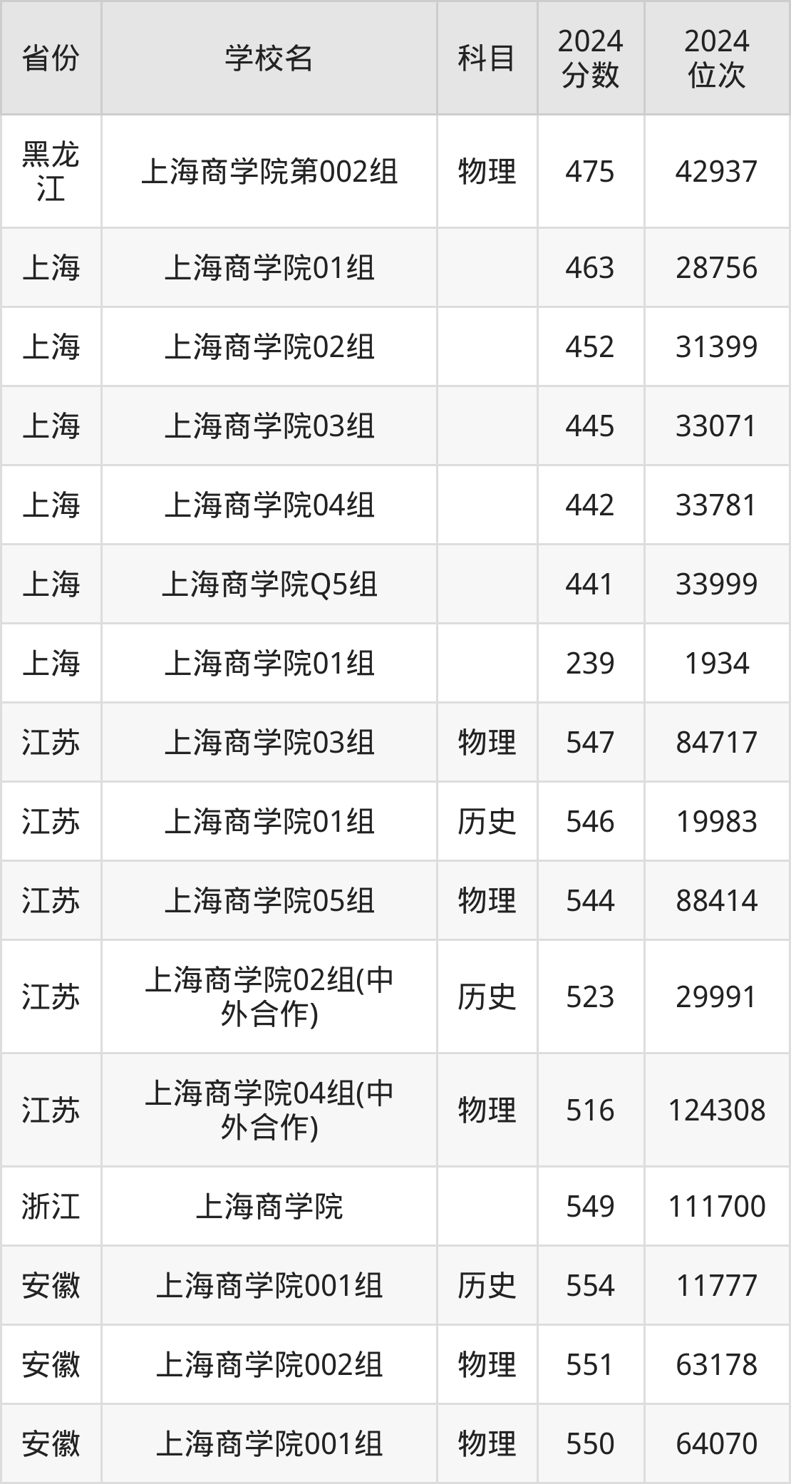 2024年上海商学院在上海市内录取最低分数线是239分,录取最低的是01组;录取分数线最高是463分,对应的是01组。
