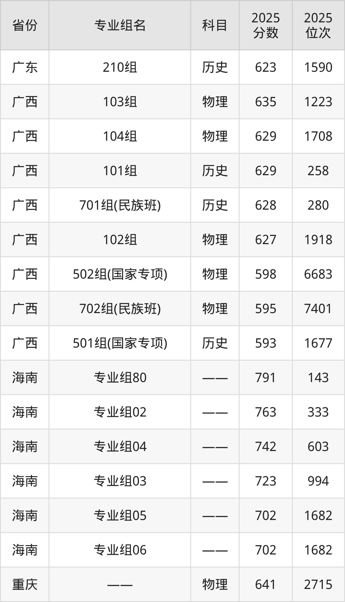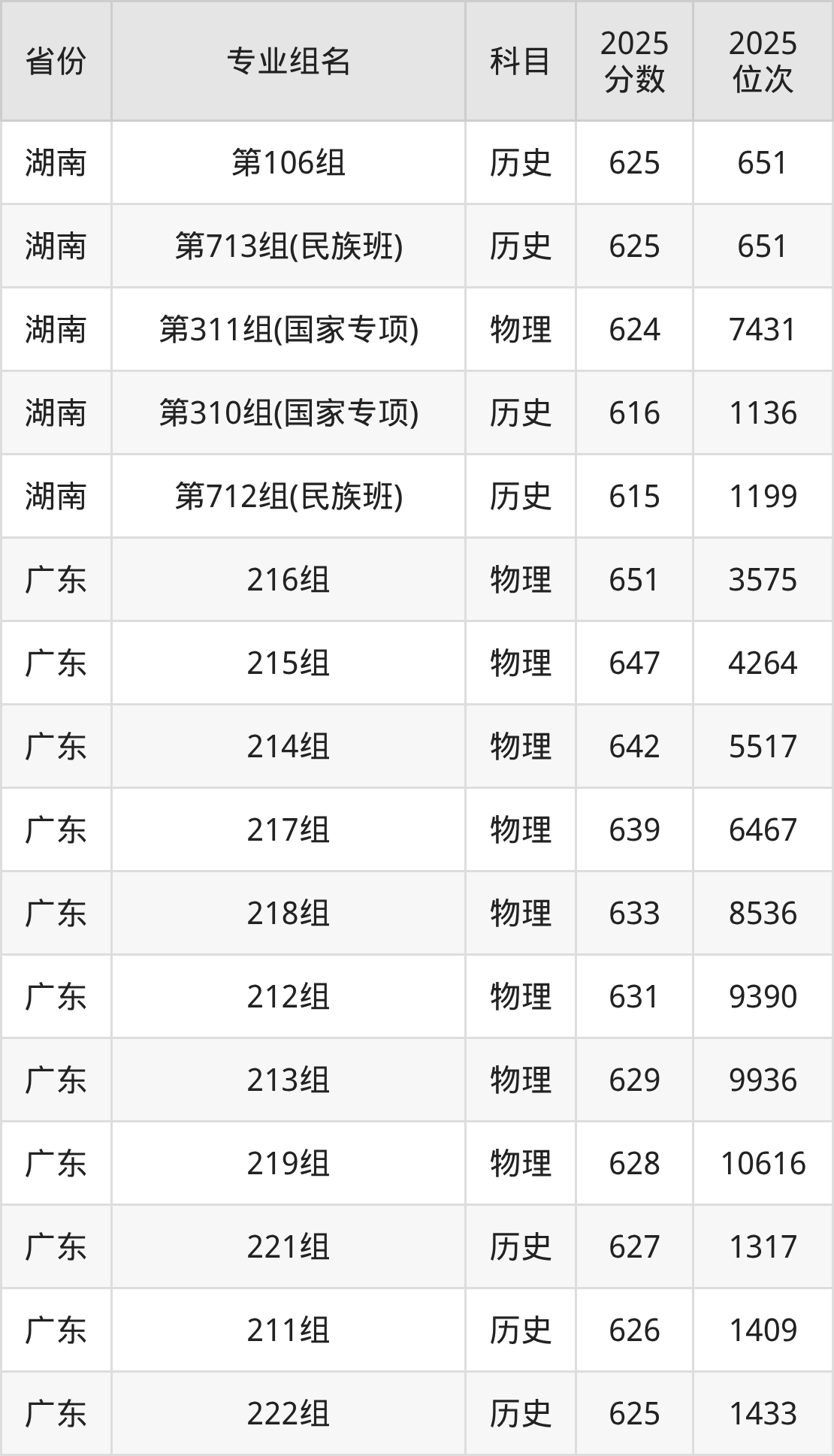 2025年中山大学在广东省内录取最低分数线是623分,录取最低的是历史类210组;录取分数线最高是651分,对应的是物理类216组。