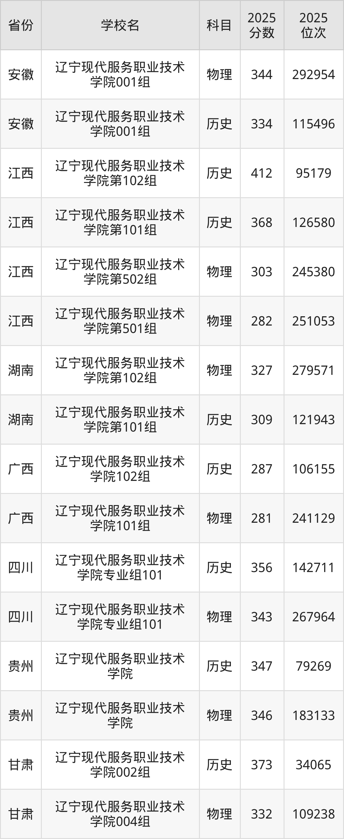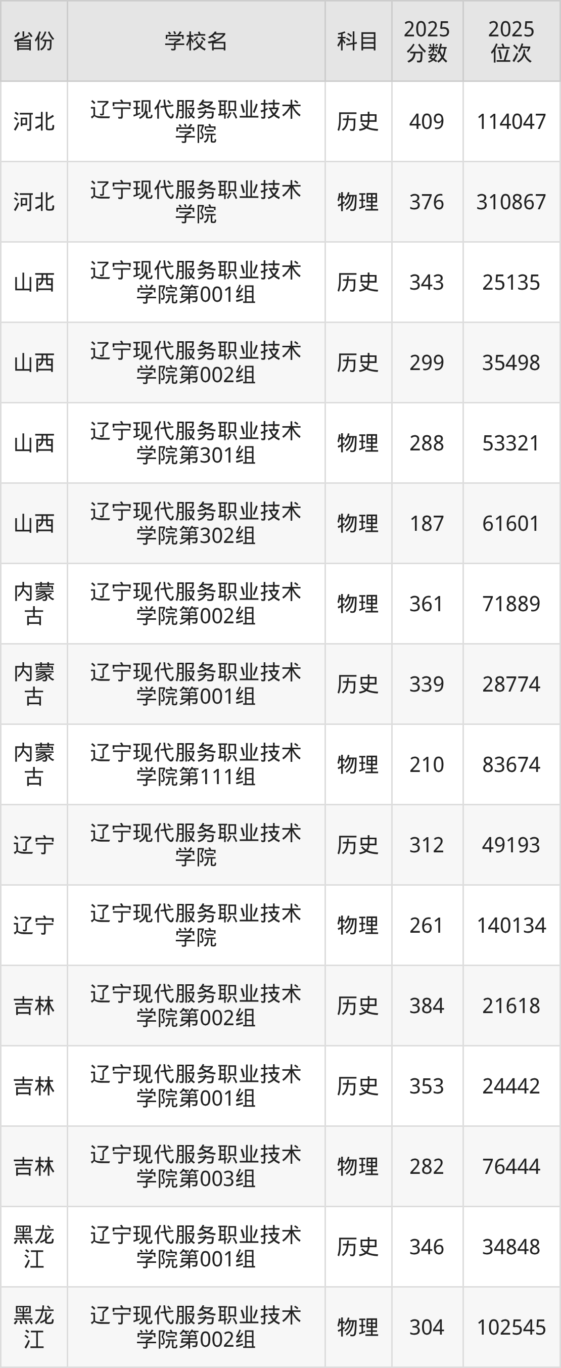 下面是辽宁现代服务职业技术学院2025年录取分数线一览表:
