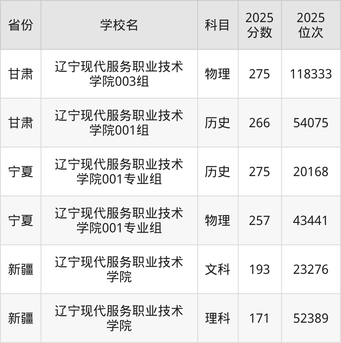 以2025年数据作为参考依据,整理辽宁省内、省外考辽宁现代服务职业技术学院要多少分。