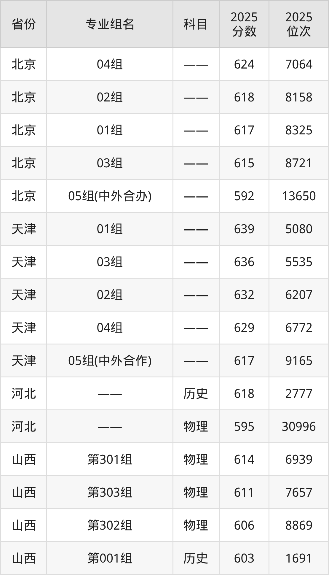2025年北京化工大学在北京市内录取最低分数线是592分,录取最低的是05组(中外合办);录取分数线最高是624分,对应的是04组。