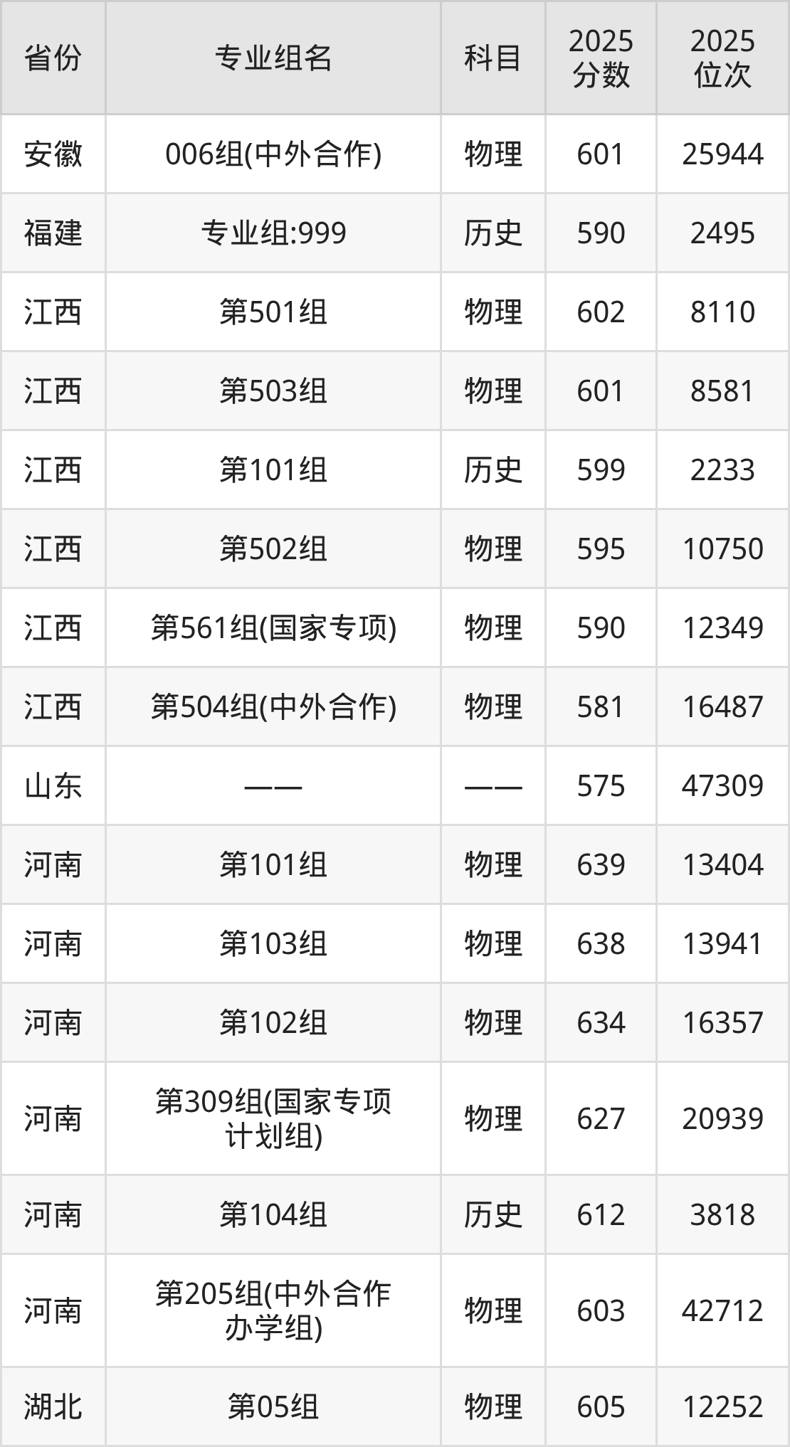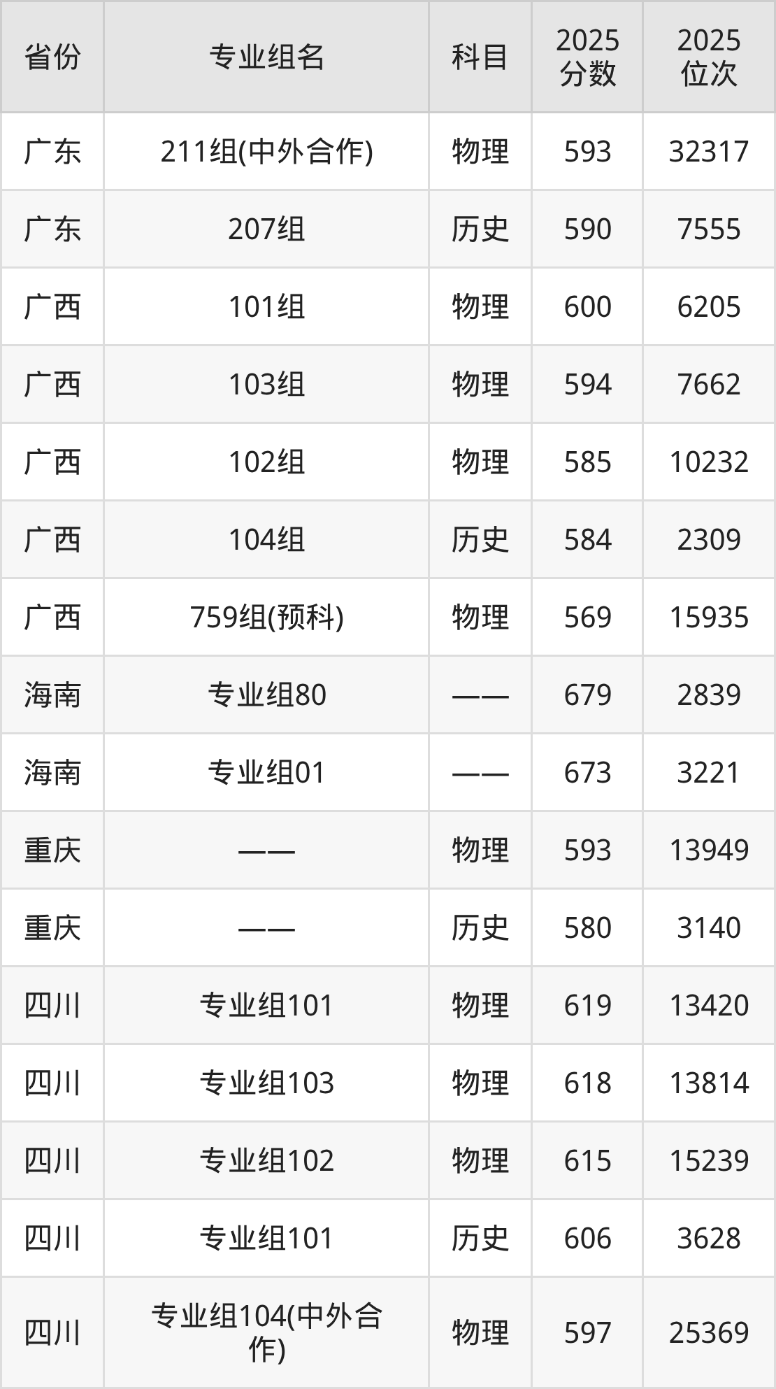 03组 612分、01组 611分、02组 611分、04组(中外合办) 591分、05组(中外合办) 590分。