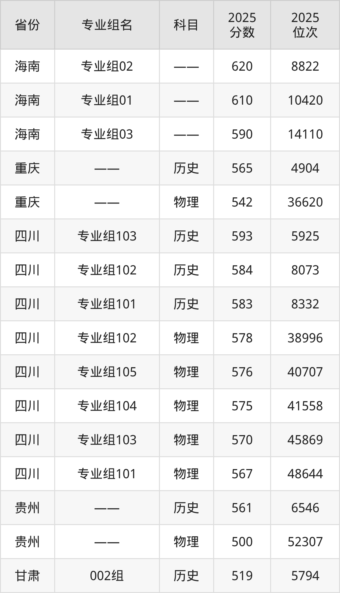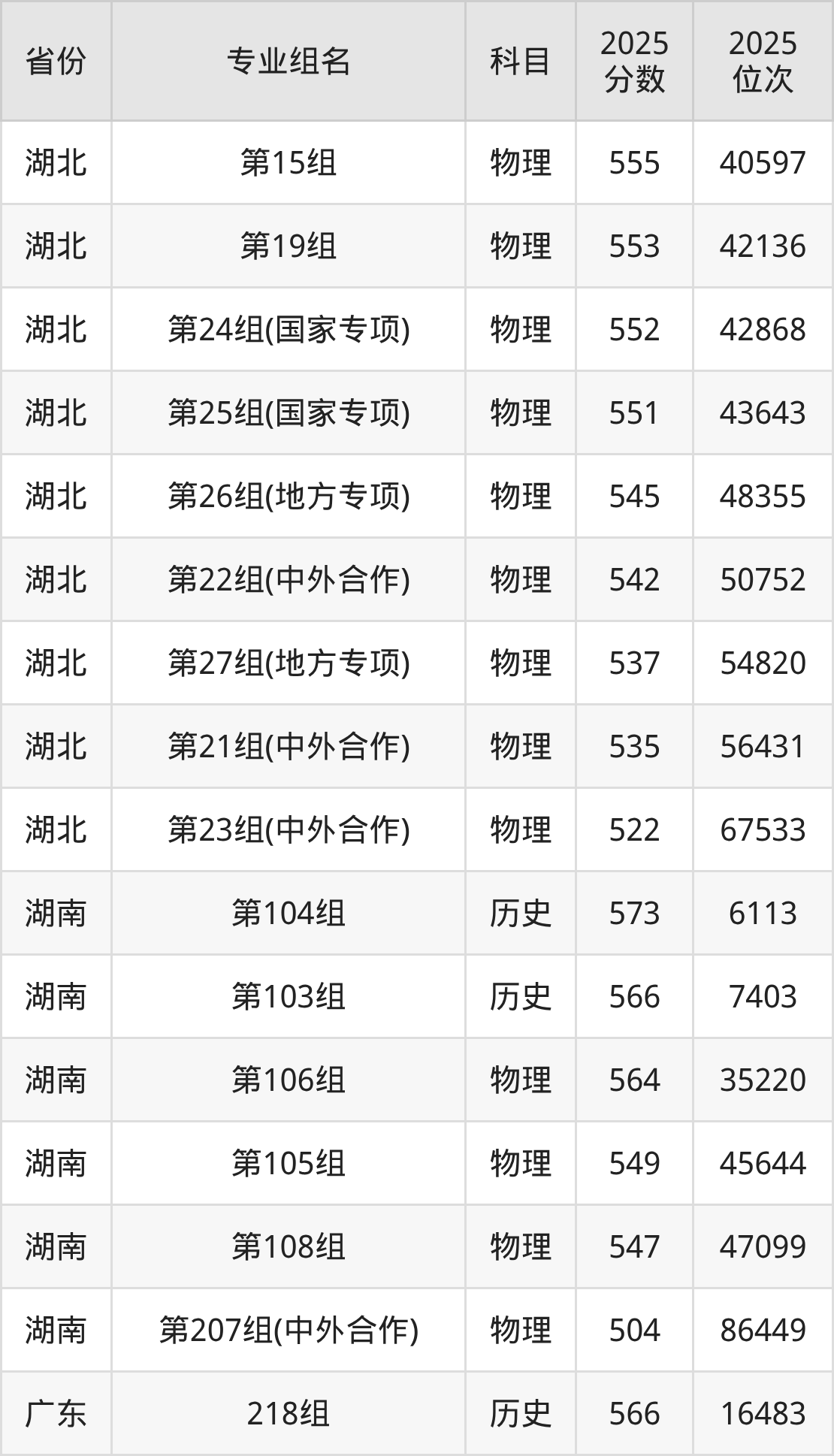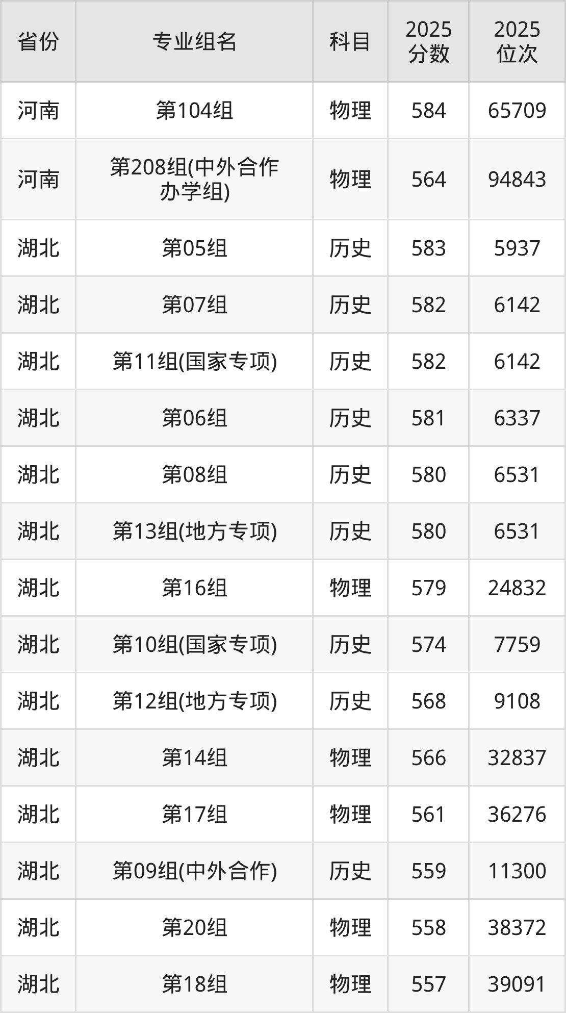2025年湖北大学在湖北省内录取最低分数线是522分,录取最低的是物理类第23组(中外合作);录取分数线最高是583分,对应的是历史类第05组。