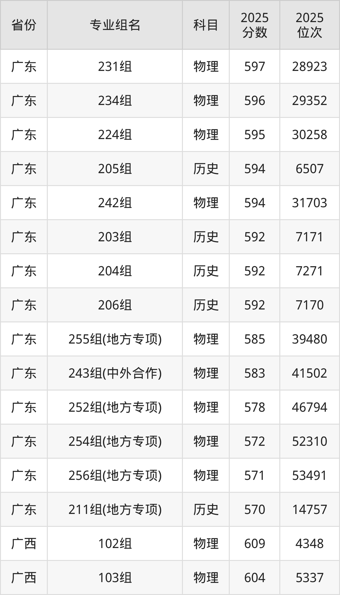 历史类:201组 598分、202组 598分、205组 594分、203组 592分、204组 592分、206组 592分、211组(地方专项) 570分。