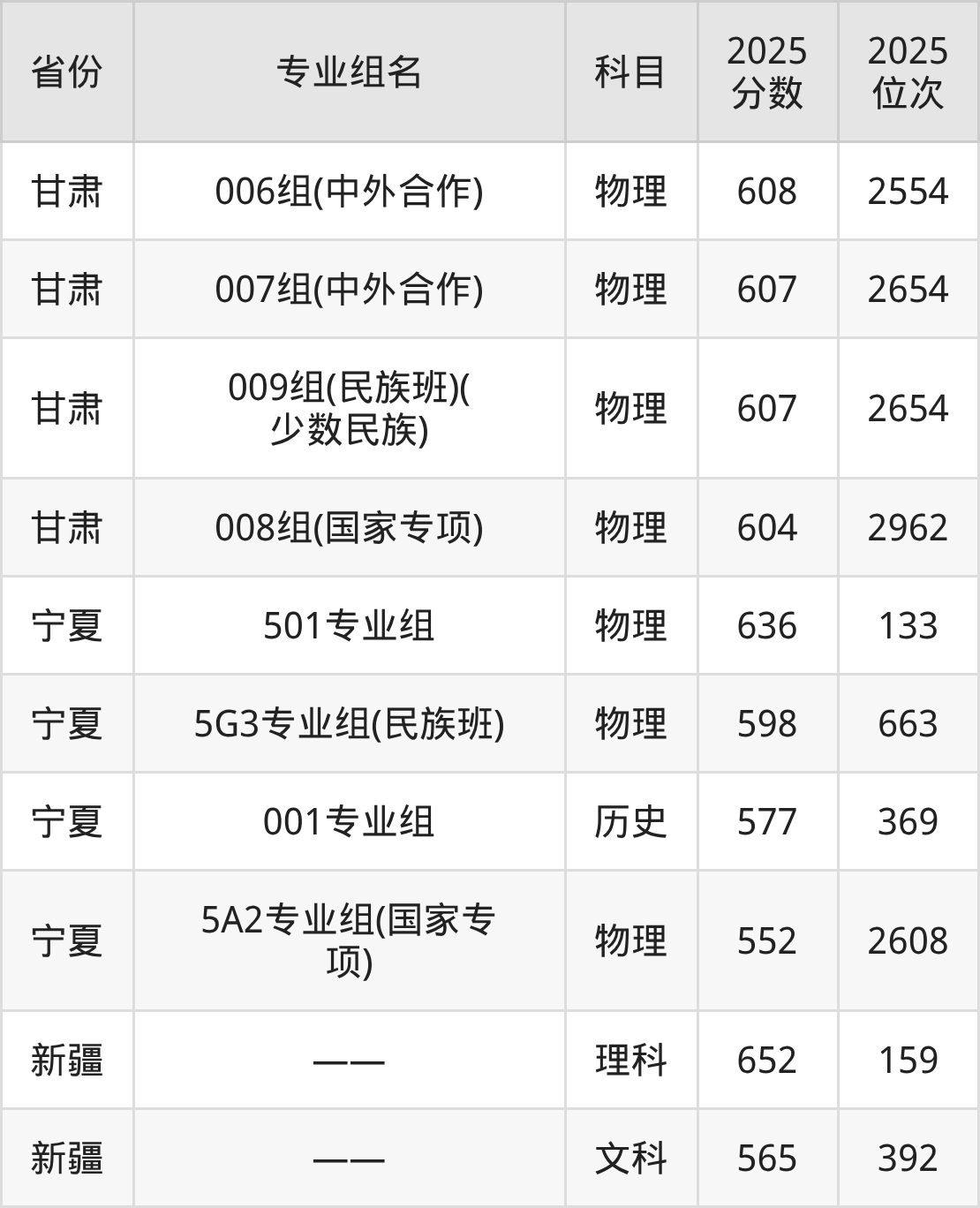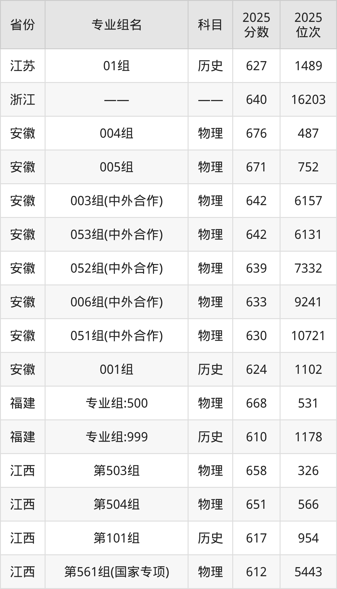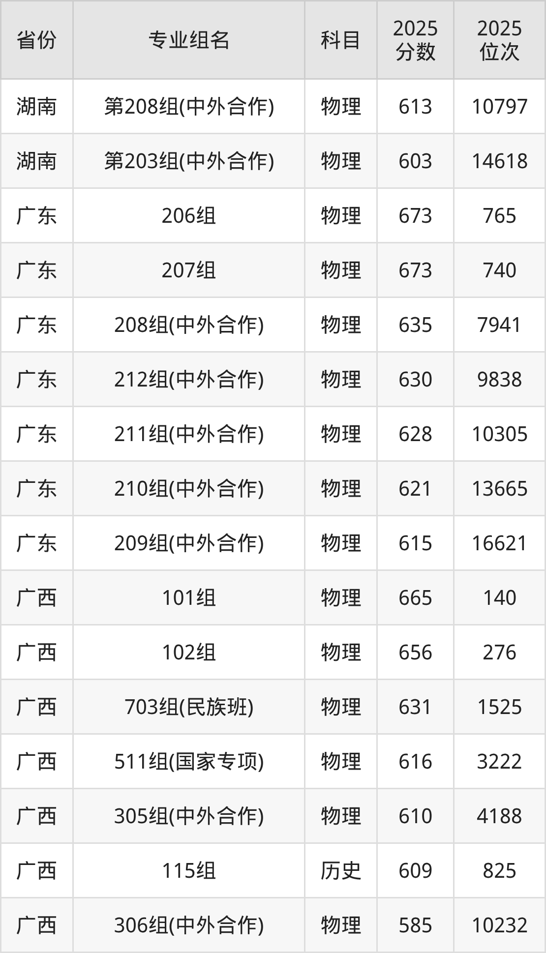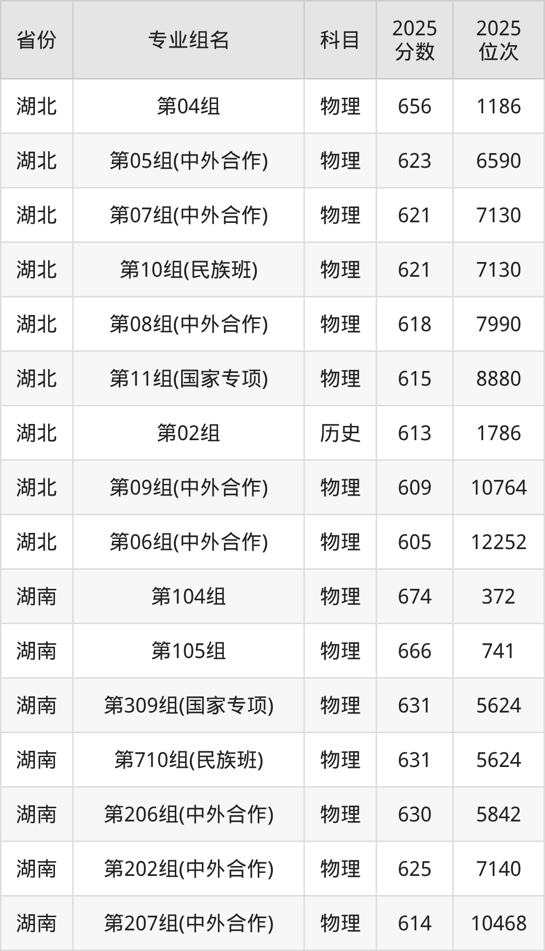 物理类:第008组 664分、第013组(民族班) 654分、第004组(国家专项) 652分、第009组 645分、第010组(中外合作) 642分、第006组(中外合作) 641分、第011组(中外合作) 640分、第012组(中外合作) 627分、第003组 624分、第007组(中外合作) 624分。