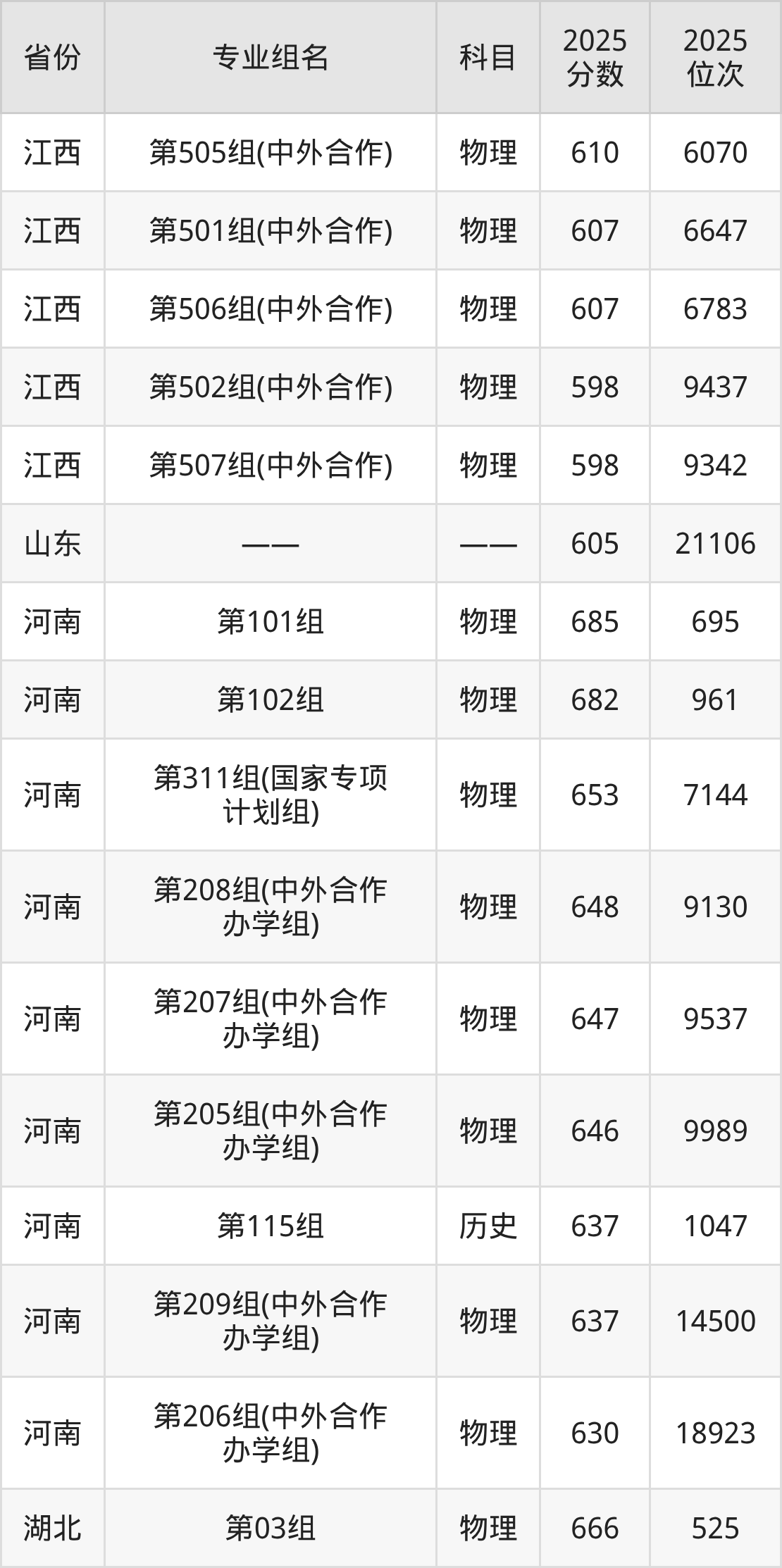 物理类:第006组 684分、第007组 670分、第008组 646分、第009组(中外合作) 618分、第004组(中外合作) 615分、第010组(中外合作) 614分、第013组(民族班) 614分、第012组(国家专项) 610分、第011组(中外合作) 606分、第005组(中外合作) 601分。